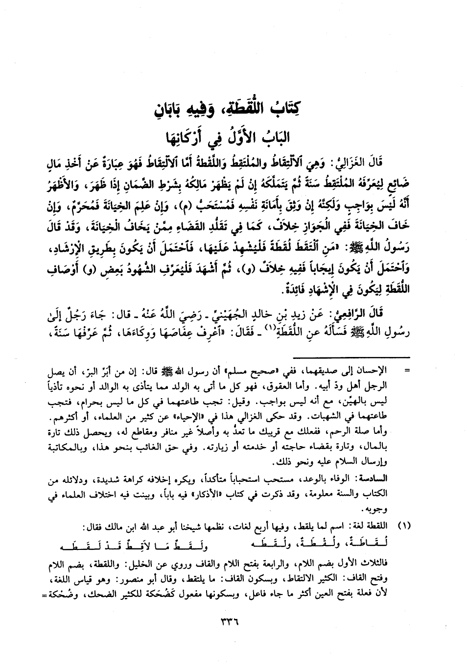 قَالَ الغَزَالِيَّ: وَهِيَ الالْتِقَاطُ والمُلْتَقِطُ وَاللَّقْطةُ أَمَّا الالْتِقَاطُ فَهُوَ عِبَارَةٌ عَنْ أَخْذِ مَالٍ ضَائِعِ لِيُعَرِّفَهُ المُلْتَقِطُ سَنَةً ثُمَّ بَتَمَلَّكَهُ إِنْ لَمْ يَظْهَرْ مَالِكُهُ بِشَرْطِ الضَّمَانِ إِذَا ظَهَرَ، وَالأَظْهَرُ أَنَّهُ لَيْسَ بِوَاجِبِ وَلَكِنَّهُ إِنْ وَثِقَ بِأمَانَةِ نَفْسِهِ فَمُسْتَحَبُّ (م)، وَإِنْ عَلِمَ الخِيَانَةَ فَمُحَرَّمٌ، وَإِنْ خَافَ الخِيَانَةَ فَفِي الُجَوَازِ خِلاَفٌ، كَمَا في تقَلُّدِ القَضَاءِ مِمَّنْ يَخَافُ الْخِيَانَةَ، وَقَدْ قَالَ رَسُولُ اللهِ -صلى الله عليه وسلم-: "مَنِ الْتَقَطَ لُقَطَةً فَليُشْهِدْ عَلَيْهَا، فَاحْتَمَلَ أَنْ يَكُونَ بِطَرِيقِ الإِرْشَادِ، وَاحْتَمَلَ أَنْ يَكُونَ إيجَاباً فَفِيهِ خِلاَفٌ (و)، ثُمَّ أَشْهَدَ فَليُعَرِّفِ الشُّهُودُ بَعِضِ (و) أَوْصَافِ اللُّقَطَةِ لِيَكُونَ في الإِشْهَادِ فَائِدَةٌ.