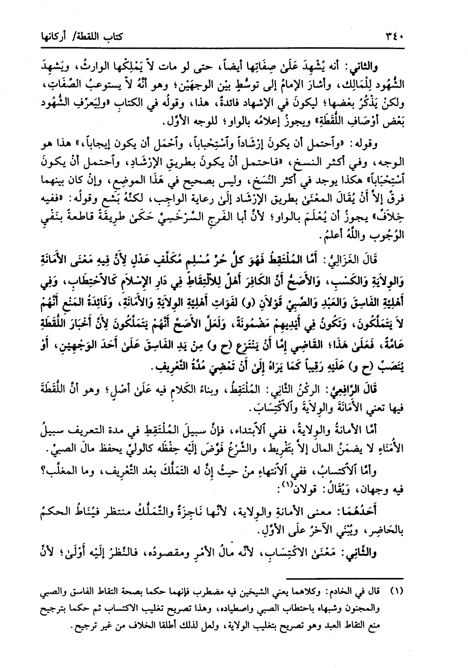 (¬1) قال في الخادم: وكلاهما يعني الشيخين فيه مضطرب فإنهما حكما بصحة التقاط الفاسق والصبي والمجنون وشبهاه باحتطاب الصبي واصطياده، وهذا تصريح تغليب الاكتساب ثم حكما بترجيح منع التقاط العبد وهو تصريح بتغليب الولاية، ولعل لذلك أطلقا الخلاف من غير ترجيح.