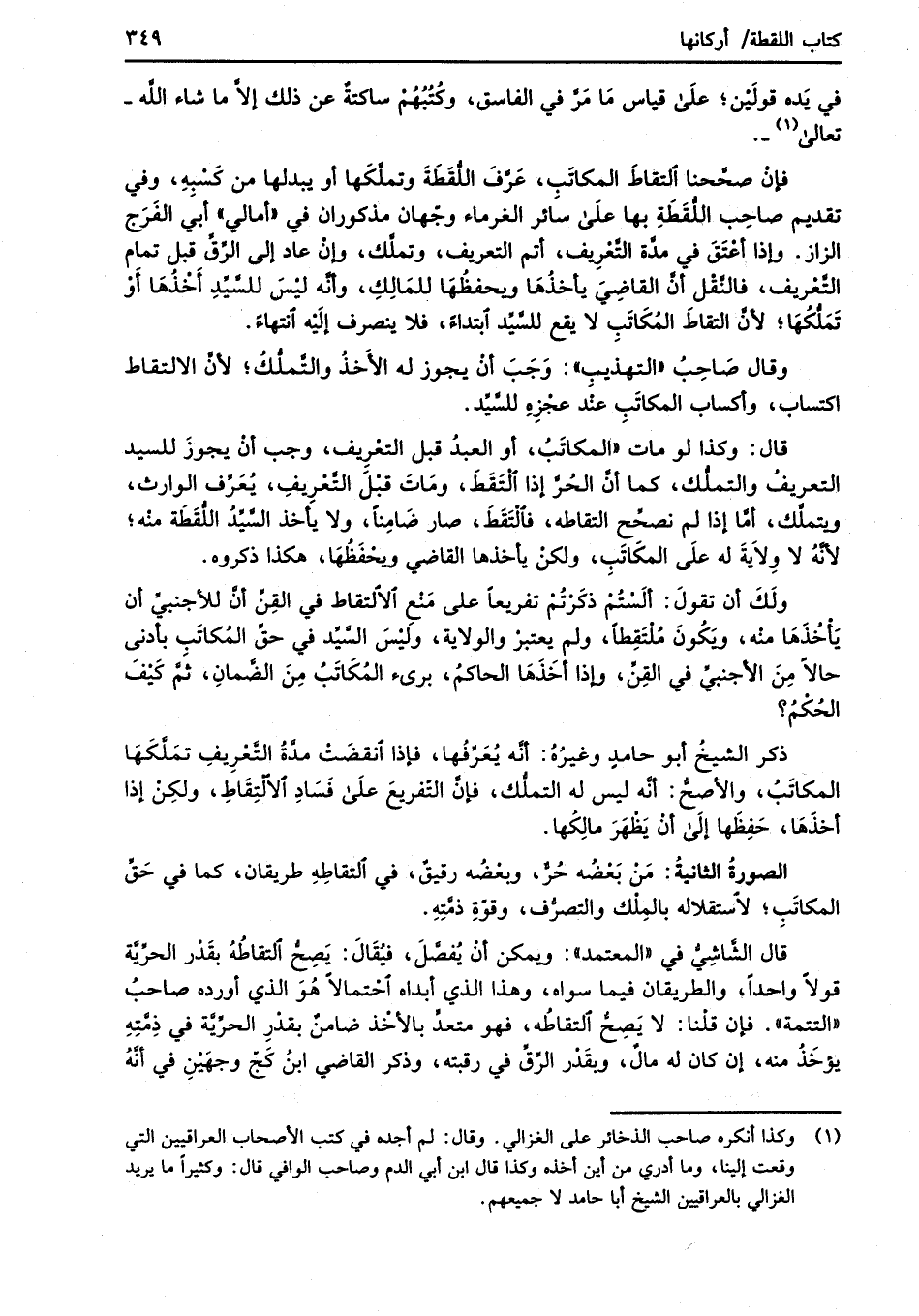 في يَده قولَيْن؛ عَلَى قياس مَا مَرَّ في الفاسق، وكُتُبُهُمْ ساكتةٌ عن ذلك إلاَّ ما شاء الله -تعالى (¬1) -. فإنْ صحَّحنا التقاطَ المكاتَبِ، عَرَّفَ اللُّقْطَةَ وتملَّكها أو يبدلها من كَسْبِهِ، وفي تقديم صاحِب اللَّقَطة بها على سائر الغرماء وجْهان مذكوران في "أمالي" أبي الفَرَج الزاز. وإذا أعْتَقَ في مدَّة التَّعْرِيف، أتم التعريف، وتملَّك، وإنْ عاد إلى الرِّقِّ قبل تمام التَّعْريف، فالنَّقْل أنَّ القاضيَ يأخذُهَا ويحفظُهَا للمَالكِ، وأنَّه ليْسَ للسَّيِّدِ أَخْذُهَا أَوْ تَمَلُّكُهَا؛ لأنَّ التقاطَ المُكَاتَبِ لا يقع للسَّيِّد ابتداءً، فلا ينصرف إلَيْه انتهاءً.