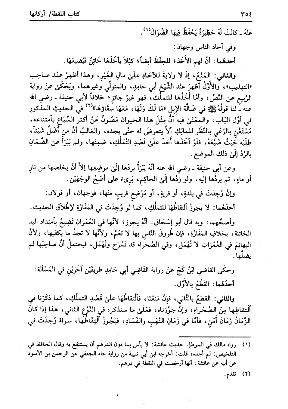 والثاني: المَنْعُ، إذْ لا ولايةَ للآحَادِ علَى مالِ الغَيْرِ، وهذا أظهرُ عنْد صاحِب "التهذيب"، والأَوَّلُ أظهرُ عنْد الشَّيْخ أبي حامِدٍ، والمتولِّي وغيرهما، وَيُحْكَى عنْ رواية الرَّبيع عن النَّصِّ، وأمَّا أَخْذُهَا للتملُّك، فهو غيرُ جائزٍ؛ خلافاً لأبي حنيفة -رضي الله عنه- لنا قولُهُ -صلى الله عليه وسلم- في ضَالَّة الإِبلِ "مَا لَكَ وَلَهَا، مَعَهَا سِقَاؤهَا" (¬2) في الحديثِ المذكورِ في أوَّل البَاب، والمعْنَى فيهَ أَنَّ مِثْلَ هذا الحيوان مَصُونٌ عَنْ أكثر السِّبَاع بامتناعه، مُسْتَغْنٍ بالرَّعْيِ بالنَّظَر للمالِكِ ألاَّ يتعرضَ له حتَّى يجده، والغالبُ أنَّ من أَضَلَّ شَيْئاً، طلَبَه حَيْثُ ضَيَّعَهُ، فلَوْ أخَذَها أَحَدٌ علَى قَصْدِ التَّمَلُّكِ، ضَمِنَها، ولم يَبْرَأ عن الضَّمَانِ بالرَّدَّ إلَى ذلك الموضع.