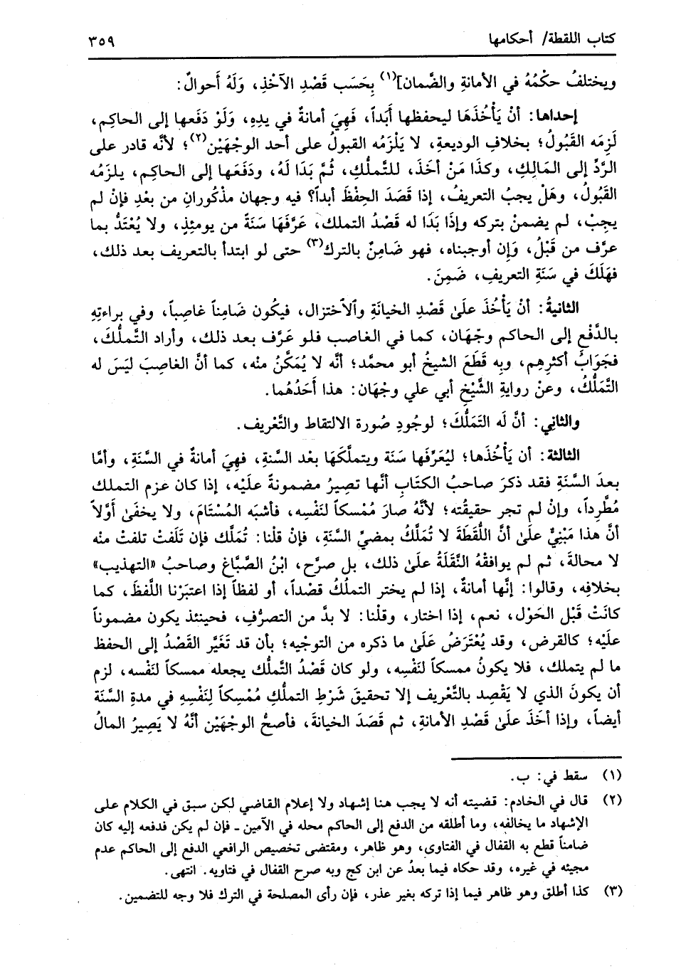 الثالثة: أن يَأْخُذَها؛ ليُعَرِّفَها سَنَة ويتملَّكَهَا بعْد السَّنةِ، فهِيَ أمانةٌ في السَّنَةِ، وأمَّا بعدَ السَّنَةِ فقد ذكرَ صاحبُ الكتَاب أنَّها تصِيرُ مضمونةً علَيْه، إذا كان عزم التملك مُطَّرِداً، وإنْ لم تجر حقيقُته؛ لأنَّهُ صَارَ مُمْسكًا لنَفْسِه، فأشبَه المُسْتَامَ، ولا يخفَى أَوَّلاً أنَّ هذا مَبْنِيٌّ عَلَى أنَّ اللُّقَطَةَ لا تُمَلَّكُ بمضيِّ السَّنَةِ، فإنْ قلْنا: تُمَلَّك فإن تَلَفتْ تلفتْ منْه لا محالةَ، ثم لم يوافقْهُ النَّقَلَةُ عَلَى ذلك، بل صرَّح، ابْنُ الصَّبَّاغ وصاحبُ "التهذيب" بخلافِه، وقالوا: إنَّها أمانةٌ، إذا لم يختر التملُكُ قصْداً، أو لفظًا إذا اعتبرْنا اللَّفظَ، كما كانَتْ قَبْل الحَوْل، نعم، إذا اختار، وقلْنا: لا بدَّ من التصرُّفِ، فحينئذ يكون مضموناً علَيْه؛ كالقرض، وقد يُعْتَرَضُ عَلَى ما ذكره من التوجْيه؛ بأن قد تَغَيَّر القَصْدُ إلى الحفظ ما لم يتملك، فلا يكونُ ممسكاً لنَفْسِه، ولو كان قَصْدُ التَّملُّك يجعله ممسكًا لنَفْسه، لزم أن يكونَ الذي لا يَقْصِد بالتَّعْريف إلا تحقيقَ شَرْطِ التملُّكِ مُمْسِكًا لنَفسِهِ في مدةِ السَّنَة أيضاً، وإذا أخَذَ عَلَى قَصْدِ الأمانةِ، ثم قَصَدَ الخيانةَ، فأصحُّ الوجْهَيْن أنَّه لا يَصِيرُ المالُ
