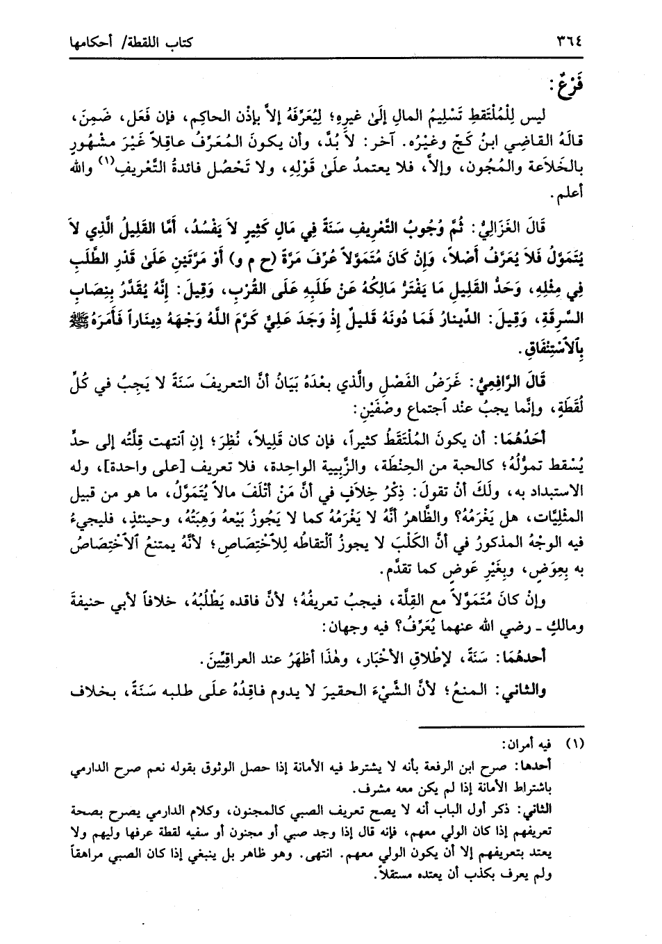 قَالَ الرَّافِعِيُّ: غَرَضُ الفَصْلِ والَّذي بعْدَهُ بَيَانُ أن التعريفَ سَنَةً لا يَجِبُ في كُلَّ لُقَطَةٍ، وإنَّما يجبُ عنْد اجتماع وصْفَيْنِ: