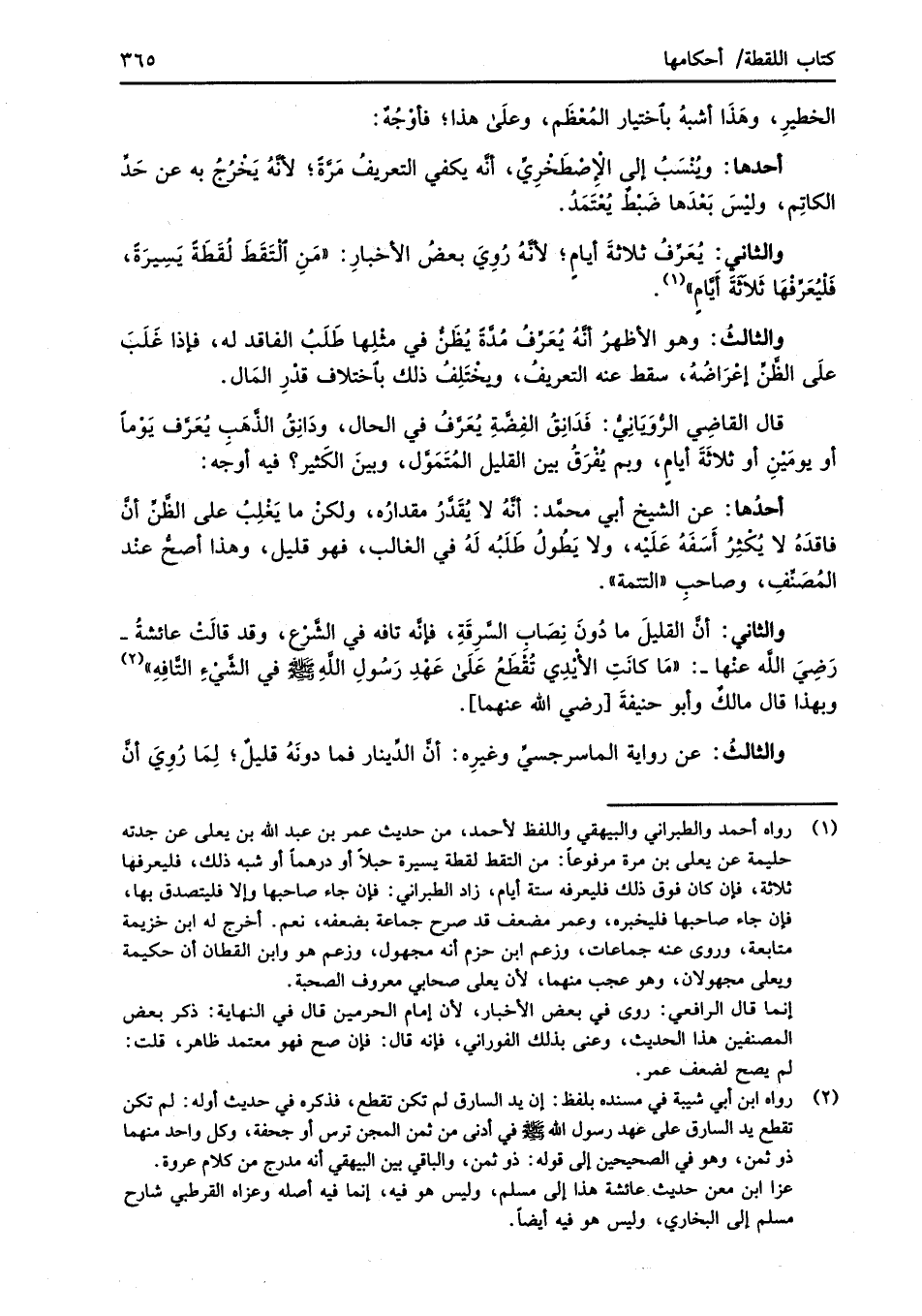(¬1) رواه أحمد والطبراني والبيهقي واللفظ لأحمد، من حديث عمر بن عبد الله بن يعلى عن جدته حليمة عن يعلي بن مرة مرفوعاً: من التقط لقطة يسيرة حبلاً أو درهماً أو شبه ذلك، فليعرفها ثلاثة، فإن كان فوق ذلك فليعرفه ستة أيام، زاد الطبراني: فإن جاء صاحبها وإلا فليتصدق بها، فإن جاء صاحبها فليخبره، وعمر مضعف قد صرح جماعة بضعفه، نعم. أخرج له ابن خزيمة متابعة، وروى عنه جماعات، وزعم ابن حزم أنه مجهول، وزعم هو وابن القطان أن حكيمة ويعلى مجهولان، وهو عجيب منهما؛ لأن يعلى صحابي معروف الصحبة.