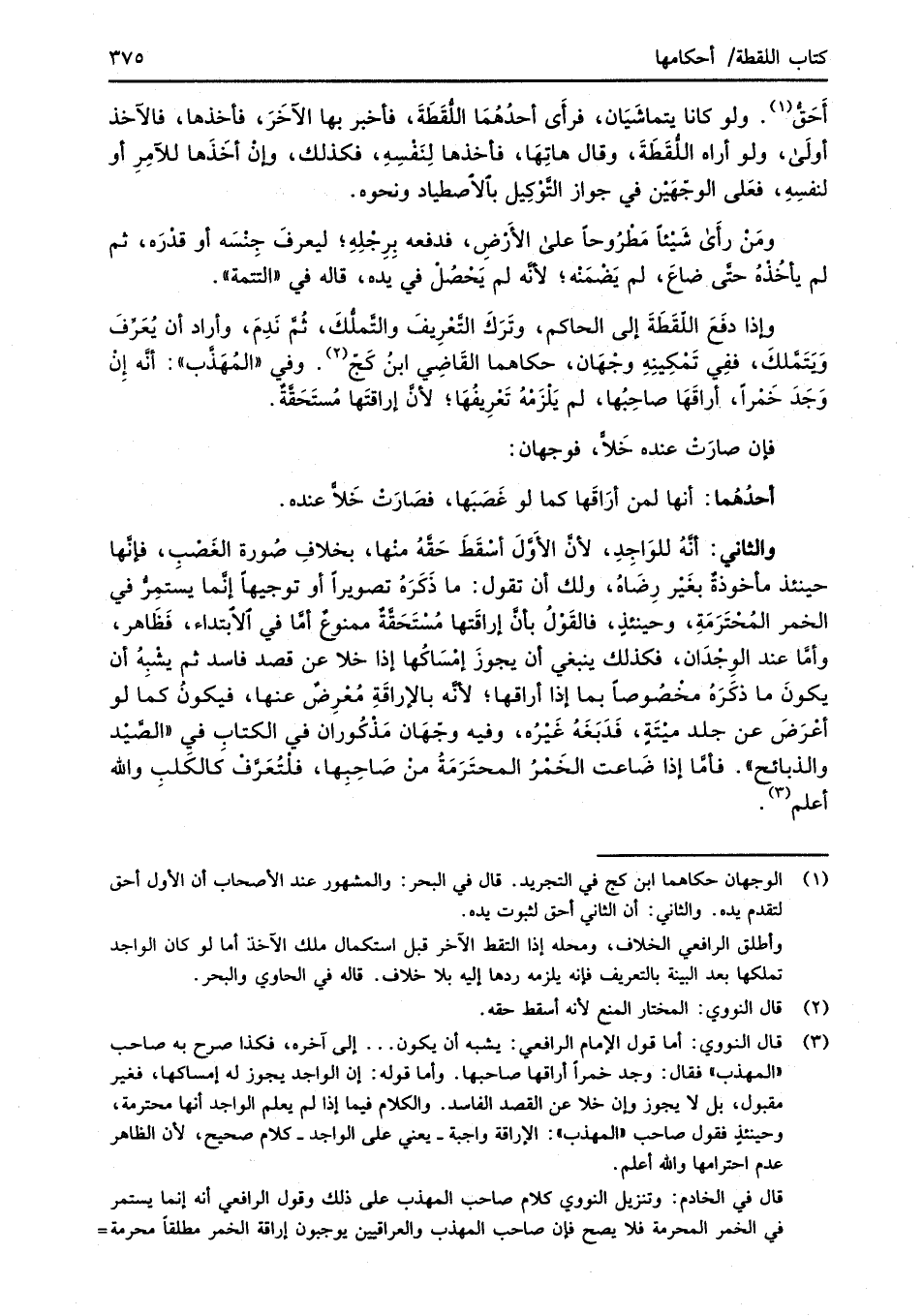 (¬3) قال النووي: أما قول الإمام الرافعي: يشبه أن يكون ... إلى آخره، فكذا صرح به صاحب "المهذب" فقال: وجد خمراً أراقها صاحبها. وأما قوله: إن الواجد يجوز له إمساكها، فغير مقبول، بل لا يجوز وإن خلا عن القصد الفاسد. والكلام فيما إذا لم يعلم الواجد أنها محترمة، وحينئذٍ فقدل صاحب "المهذب": الإراقة واجبة -يعني على الواجد- كلام صحيح؛ لأن الظاهر عدم احترامها والله أعلم.