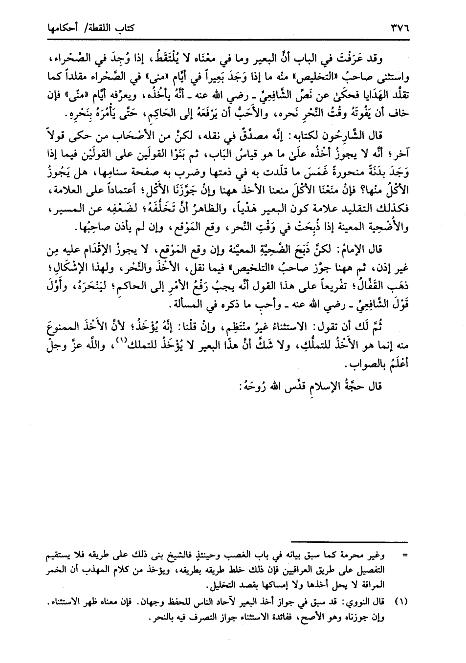(¬1) قال النووي: قد سبق في جواز أخذ البعير لآحاد الناس للحفظ وجهان. فإن معناه ظهر الاستثناء. وإن جوزناه وهو الأصح، ففائدة الاستثناء جواز التصرف فيه بالنحر.
