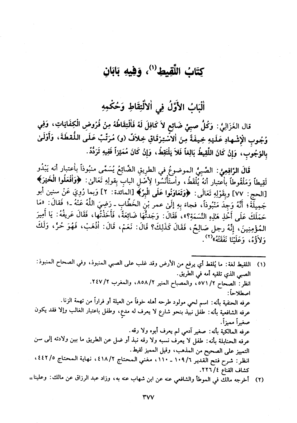 قَالَ الرَّافِعِيُّ: الصَّبِىُّ الموضوعُ في الطرِيقِ الضَّائِعُ يُسَمَّى منبُوذاً باعتبار أنه يَبْدُو لَقِيطاً وَمَلْقُوطاً باعتبار أنهُ يُلْقَطُ، واستَأْنَسُوا لِأصْل الباب بِقولِهِ تَعَالى: {وَافْعَلُوا الْخَيْرَ} [الحج: 77] وبِقَولِهِ تَعَالَى: {وَتَعَاوَنُوا عَلَى الْبِرِّ} [المائدة: 2]، وَبما رُوِيَ عَنْ سنين أبو جَمِيلَةَ؛ أَنَّهُ وَجدَ مَنْبُوذاً، فجاءَ بهِ إلَى عمر بْنِ الخَطَّاب -رَضِيَ اللَّهُ عَنْهُ-؛ فَقالَ: "مَا حَمَلَكَ عَلَى أَخْذِ هَذِهِ النَّسَمَةِ؟ "، فَقَالَ: وَجَدتُّهَا ضَائِعَةً، فَأَخَذْتُها، فَقَالَ عَريفُهُ: يَا أَمِيرَ المُؤْمِنِينَ، إِنَّهُ رجل صَالِحٌ، فَقَالَ كَذَلِكَ؟ قَالَ: نَعَمْ، قَالَ: اذْهَبْ، فَهُوَ حُرٌّ، وَلَكَ وَلاَؤُءُ، وَعَلَيْنَا نَفَقَتُهُ" (¬2).