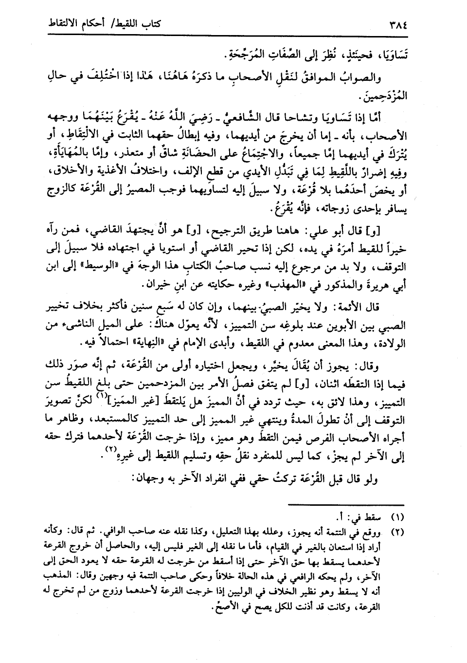 أمَّا إذا تَسَاوَيا وتشاحا قال الشَّافعيُّ -رَضِيَ اللهُ عَنْهُ- يُقْرَعُ بَينَهُمَا ووجهه الأصحاب، بأنه -إما أن يخرجَ من أيديهما، وفيه إبطالُ حقهما الثابت في الالْتِقَاطِ، أو يُتْرَكَ في أيديهما إمَّا جميعًا، والاجْتِمَاعُ على الحضَانَةِ شاقٌ أو متعذر، وأمَّا بالمُهَايَأَةِ، وفِيهِ إضرارٌ باللَّقِيطِ لِمَا في تَبَدُّلِ الأيدي من قطعِ الإلف، واختلافُ الأغذية والأخلاق، أو يخصَ أحدَهُما بلا قُرْعَة، ولا سبيلَ إليه لتساويهما فوجب المصيرُ إلى القُرْعَة كالزوج يسافر بإحدى زوجاته، فإنَّه يُقْرَعُ.