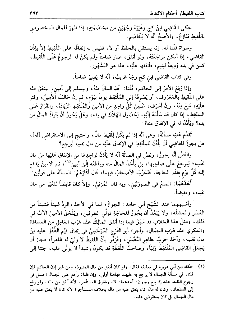 وإذا رُفِعَ الأمرُ إلى الحاكم، قُلْنا: خُذِ المالَ منْهُ، وليسلم إلى أمينِ، لينفقَ منْه على اللَّقيطِ بالمَعْرُوف، أو يَصْرِفَهُ إلى المُلْتَقِطِ يوماً بيَوْمٍ، ثم إنْ خالفَ الأَمِينُ، وقتر علَيْهِ، مُنِعَ مِنْهُ، وإنْ أسْرَفَ، ضَمِنَ كُلُّ واحِدٍ من الأمين وَالمُلْتَقِطِ الزِّيَادَةَ، والقَرَارُ عَلى الملتَقِط، إذا كان قد سَلَّمَهُ إلَيْهِ، لِحُصُول الهَلاَك في يده، وهَلْ يَجُوزُ أنْ يَتْركَ المالَ من يده؟ وَيأْذَنُ له في الإنفاق منه؟
