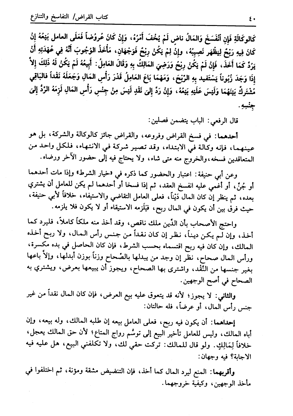 وعن أبي حنيفة: اعتبار والحضور كما ذكره في "خيار الشرط" وإذا مات أحدهما أو جُنَّ، أو أغمي عليه انفسخ العقد، ثم إذا فسخا أو أحدهما لم يكن للعامل أن يشتري بعده، ثم ينظر إن كان المال دَيْناً، فعلى العامل التقاضي والاستيفاء، خلافاً لأبي حنيفة، حيث فرق بين أن يكون في المال ربح، فيَلَزمه الاستيقاء أو لا يكون فلا يلزمه.