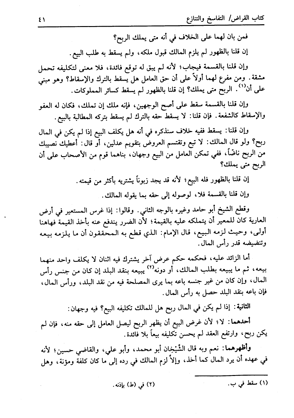 وقطع الشيخ أبو حامد وغيره بالوجه الثاني. وقالوا: إذا غرس المستعير في أرض العارية كان للمعير أن يتملكه عليه بالقيمة؛ لأن الضرر يندفع عنه بأخذ القيمة فهاهنا أولى، وحيث لزمه البيع، قال الإمام: الذي قطع به المحققون أن ما يلزمه بيعه وتنضيضه قدر رأس المال.