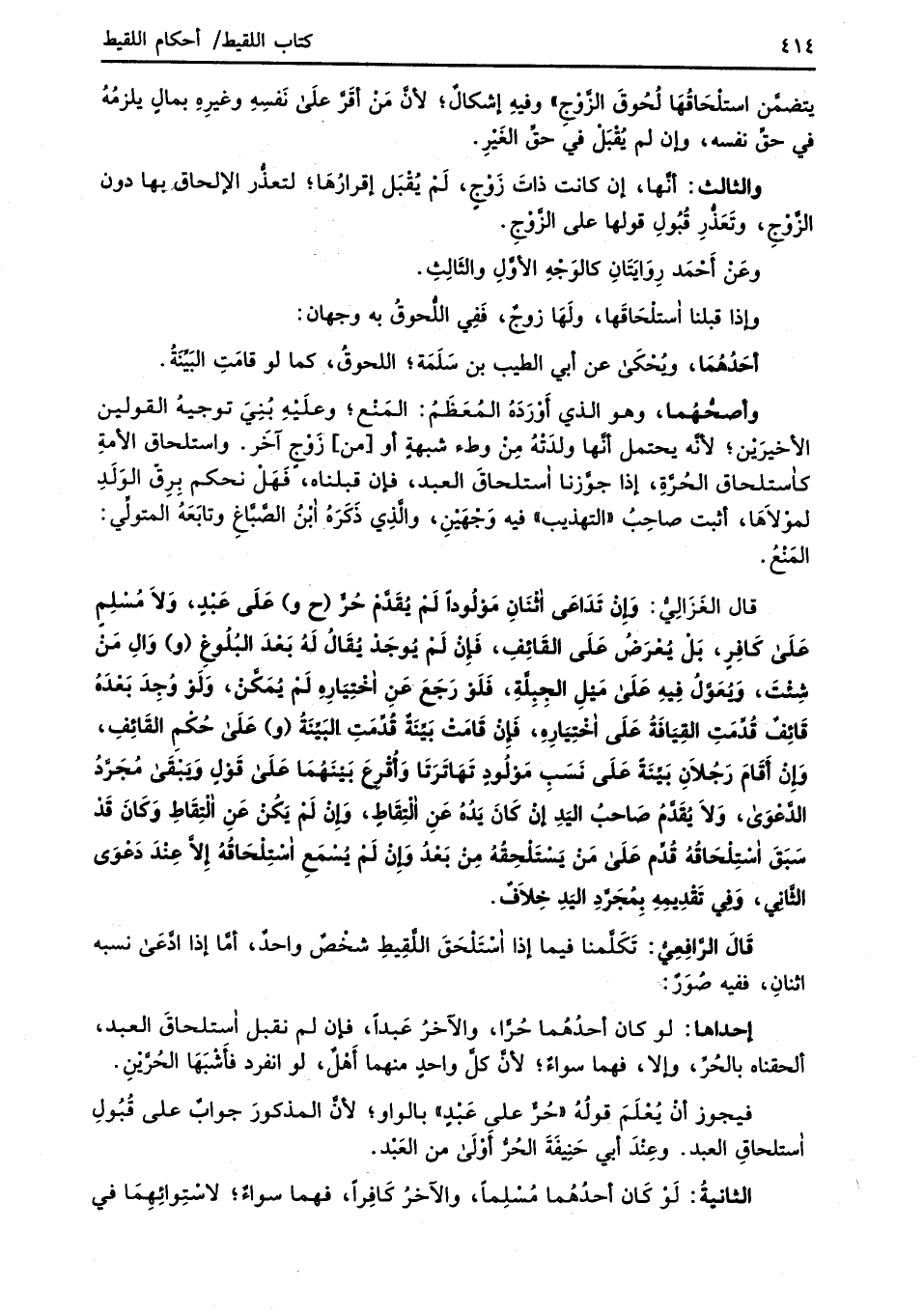 قال الغَزالِيُّ: وَإِنْ تَدَاعَى اثْنَانِ مَوْلُوداً لَمْ يُقَدَّمْ حُرٌّ (ح و) عَلَى عَبْدٍ، وَلاَ مُسْلِمٍ عَلَى كَافِرٍ، بَلْ يُعْرَضُ عَلَى القَائِفِ، فَإِنْ لَمْ يُوجَدْ يُقَالُ لَهُ بَعْدَ البُلُوغِ (و) وَالِ مِنْ شِئْتَ، وَيُعَوَّلُ فِيهِ عَلَى مَيْلِ الجِبِلَّةِ، فَلَوْ رَجَعَ عَنِ اخْتِيَارِهِ لَمْ يُمَكَّنْ، وَلَوْ وُجِدَ بَعْدَهُ قَائِفٌ قُدِّمَتِ القِيَافَةُ عَلَى اخْتِيَارِهِ، فَإنْ قَامَتْ بَيِّنَة قُدِّمَتِ البَيِّنةُ (و) عَلَى حُكْمِ القَائِفِ، وَإِنْ أَقَامَ رَجُلاَنِ بَيِّنَةً عَلَى نَسَبِ مَوْلُودٍ تَهَاتَرَتَا وَأُقْرعَ بَيْنَهُمَا عَلَى قَوْلٍ وَيَبْقَى مُجَرَّدُ الدَّعْوَى، وَلاَ يُقَدَّمُ صَاحبُ اليَدِ إنْ كَانَ يَدُهُ عَنِ الْتِقَاطٍ، وَإِنْ لَمْ يَكُن عَنِ الْتِقَاطِ وَكَانَ قَدْ سَبَقَ اسْتِلْحَاقُهُ قُدِّم عَلَى من يَسْتَلْحِقُهُ مِنْ بَعْدُ وَإِنْ لَمْ يُسْمَعِ اسْتِلْحَاقُهُ إِلاَّ عِنْدَ دَعْوَى الثَّانِي، وَفِي تَقْدِيمِهِ بِمُجَرَّدِ اليَدِ خِلاَفٌ.