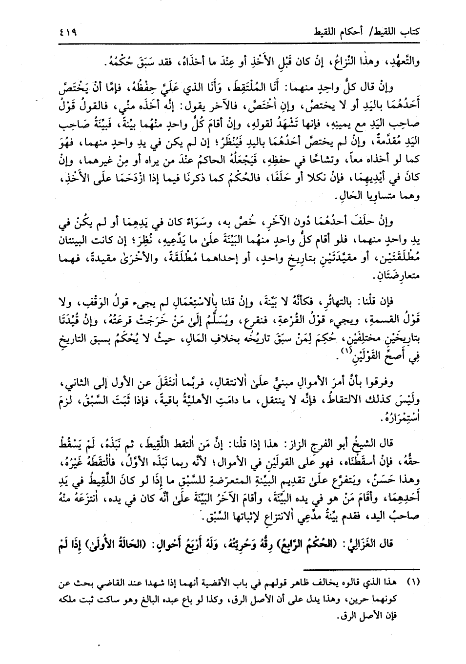 وإنْ قال كلُّ واحِدٍ منهما: أَنَا المُلْتَقِطَ، وَأَنَا الذي عَلَىَّ حِفْظُهُ، فإمَّا أنْ يَخْتَصَّ أَحَدُهُمَا باليَدِ أو لا يختصَّ، وإنِ اخْتَصَّ، فالآخر يقول: إنَّه أخَذَه منِّى، فالقولُ قَوْلُ صاحِب اليَدِ مع يمينِهِ، فإنها تَشْهَدُ لقولهِ، وإنْ أقامَ كُلُّ واحدٍ منْهُما بيِّنةً، فَبيِّنَةُ صَاحِب اليَدِ مُقدَّمةٌ، وإنْ لم يختصَّ أحَدُهُمَا باليدِ فَيُنْظَرُ؛ إن لم يكن في يدِ واحدٍ منهما، فهُوَ كما لو أخذاه معاً، وتشاحَّا في حفظِهِ، فَيَجْعَلُهُ الحاكمُ عنْدَ من يراه أو مِنْ غيرهما، وإنْ كانَ في أيْدِيهِمَا، فإنْ نكلا أو حَلَفَا، فالحُكْمُ كما ذكرنَا فيما إذا ازْدَحَمَا علَى الأَخْذِ، وهما متساوِيا الحَالِ.