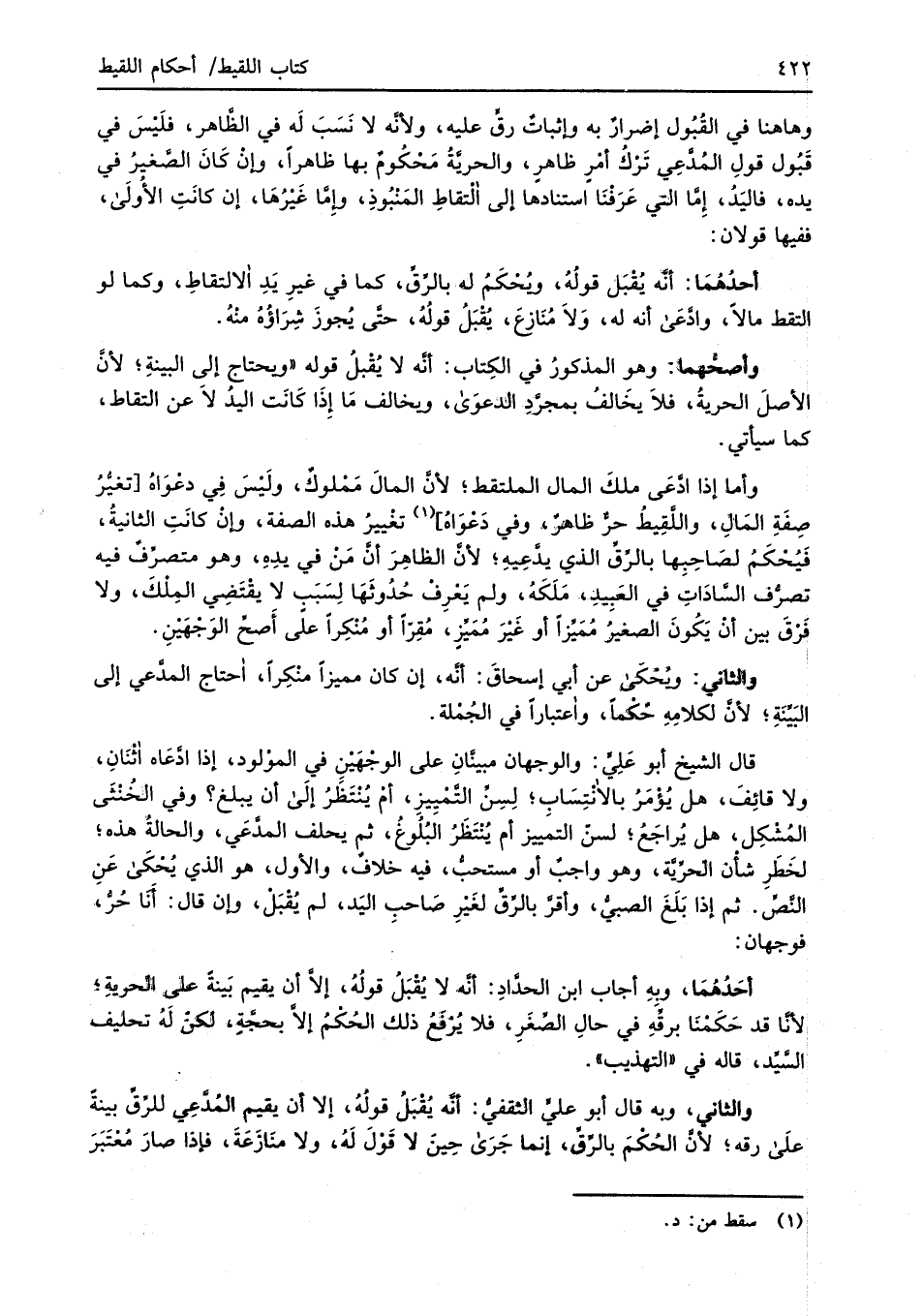 وهاهنا في القُبُول إضرارٌ به وإثباتٌ رقٍّ عليه، ولأنَّه لا نَسَبَ لَه في الظَّاهر، فلَيْسَ في قَبُول قولِ المُدَّعِي ترْكُ أمْرٍ ظاهرٍ، والحريَّةُ محْكُومٌ بها ظاهرًا، وإنْ كَانَ الصَّغيرُ في يده، فاليَدُ، إمَّا التي عَرَفْنَا استنادها إلى الْتقاطِ المنَبُوذِ، وإِمَّا غَيْرُها، إن كانَتِ الأُولَى، ففيها قولان: