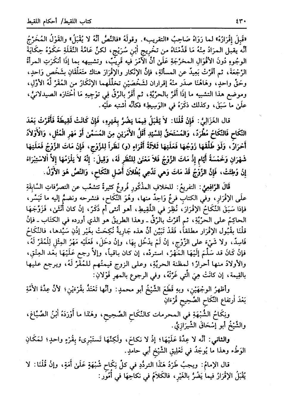 قال الغَزَالِيُّ: فَإنْ قُلْنَا: لا يُقْبَلُ فِيمَا يَضُرُّ بِغَيْرِهِ، فَإِنْ كَانَتْ لَقِيطَةَ فأَقَرَّتْ بَعْدَ النِّكَاحِ فَالنِّكَاحُ مُطَّرَدٌ، والمُسْتَحَقُّ لِلسَّيِّدِ أَقَلُّ الأَمْرَيْنِ مِنَ المُسَمَّى أَوْ مَهْرِ الْمُثْلِ، والأَوْلادُ أَحْرارٌ، وَلَوْ طَلَّقَها زَوْجُهَا فَعَلَيْهَا ثَلاَثةُ أَقْرَاءٍ (و) نَظَراً لِلزَّوْجِ، فَإِنْ مَاتَ الزَّوْجُ فَعَلَيْهَا شَهْرَانِ وَخَمْسَةُ أَيَّامِ إِذْ مَاتَ الزَّوْجُ فَلاَ مَعْنَى لِلنَّظَرِ لَهُ، وَقِيلَ: إِنَّهُ لاَ يَلْزَمُها إِلاَّ الاسْتِبْرَاءُ إنْ وطِئَتْ، فَإنَّ الزَّوْجُ قَدْ مَاتَ وَهي تَدَّعِي بُطْلاَنَ أَصْلِ النِّكَاحِ، وَالنَّصُّ هُوَ الأَوَّلُ.