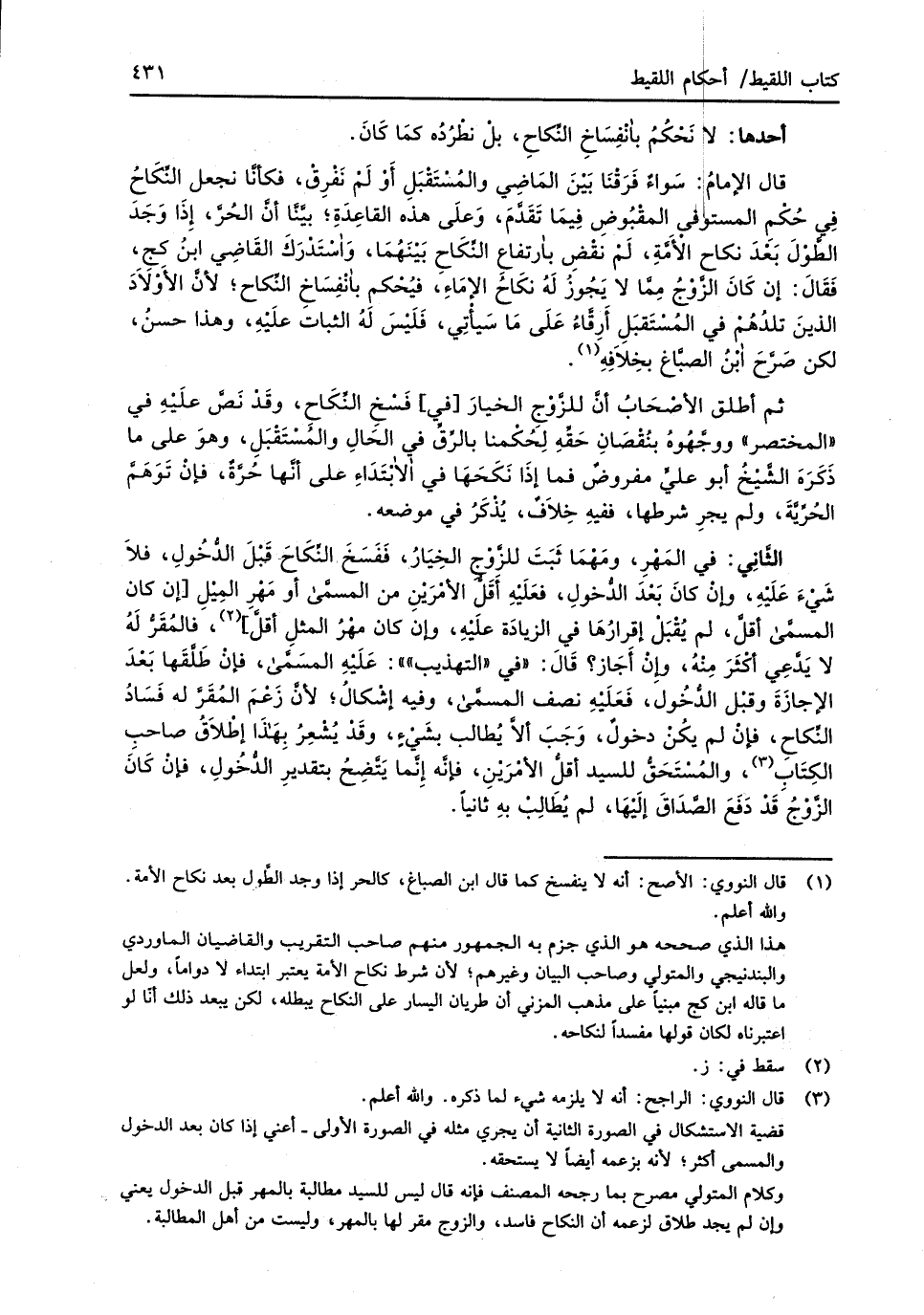 قال الإمامُ: سَواءٌ فَرَقنا بَيْنَ الماضِي والمُسْتَقْبَلِ أَوْ لَمْ نَفْرِقْ، فكأنَّا نجعل النِّكَاحُ فِي حُكْمِ المستوفي المقْبُوضِ فِيما تَقَدَّمَ، وَعلَى هذه القاعِدَةِ؛ بيَّنَّا أنَّ الحُرَّ، إِذَا وَجَدَ الطَّوْلَ بَعْدَ نكاح الأمَّةِ، لَمْ نقْضِ بارتفاعِ النِّكَاح بَيْنَهُمَا، وَاسْتَدْرَكَ القَاضِي ابنُ كج، فَقَالَ: إنْ كَانَ الزَّوْجُ مِمَّا لا يَجُوزُ لَهُ نكَاحُ الإمَاءِ، فيُحْكم بانْفِسَاخِ النِّكاح؛ لأنَّ الأَوْلاَدَ الذينَ تلدُهُمْ في المُسْتَقبَلِ أَرِقَّاءُ عَلَى مَا سَيأْتِي، فَلَيْسَ لَهُ الثبات علَيْهِ، وهذا حسنُ، لكن صَرَّحَ ابْنُ الصبَّاغ بخِلاَفِهِ (¬1).