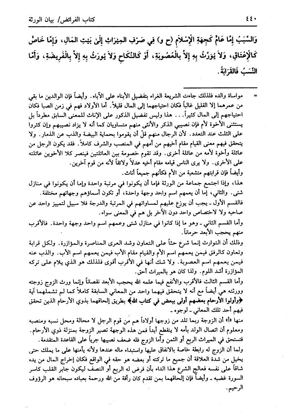 = مواساة والده فلذلك جاءت الشريعة الغراء بتفضيل الأبناء على الآباء. وأيضاً فإن الوالدين ما بقي من عمرهما إلا القليل غالباً فكان احتياجهما إلى المال قليلاً. أما الأولاد فهم في زمن الصبا فكان احتياجهم إلى المال كثيراً ... هذا وليس تفضيل الذكور على الإناث للمعنى السابق مطرداً بل يستثنى الأخوة لأم فإن نصيبي الذكر والأنثى منهم متساويان كما أنه لا يزاد نصيبهم وإن كثروا على الثلث عند التعدد. لأن الرجال منهم قلّ أن يقوموا بحماية البيضة والذب عن الذمار. ولا يتحقق فيهم معنى القيام مقام أخيهم من أمهم في المنصب والشرف كاملاً. فقد يكون الرجل من عائلة وأخوة لأمه من عائلة أخرى. وقد تقوم خصومة بين العائلتين فينصر كلا الأخوين عائلته على الأخرى. ولا يرى الناس قيامه مقام أخيه عدلاً ولائقاً لأنه من قوم آخرين.