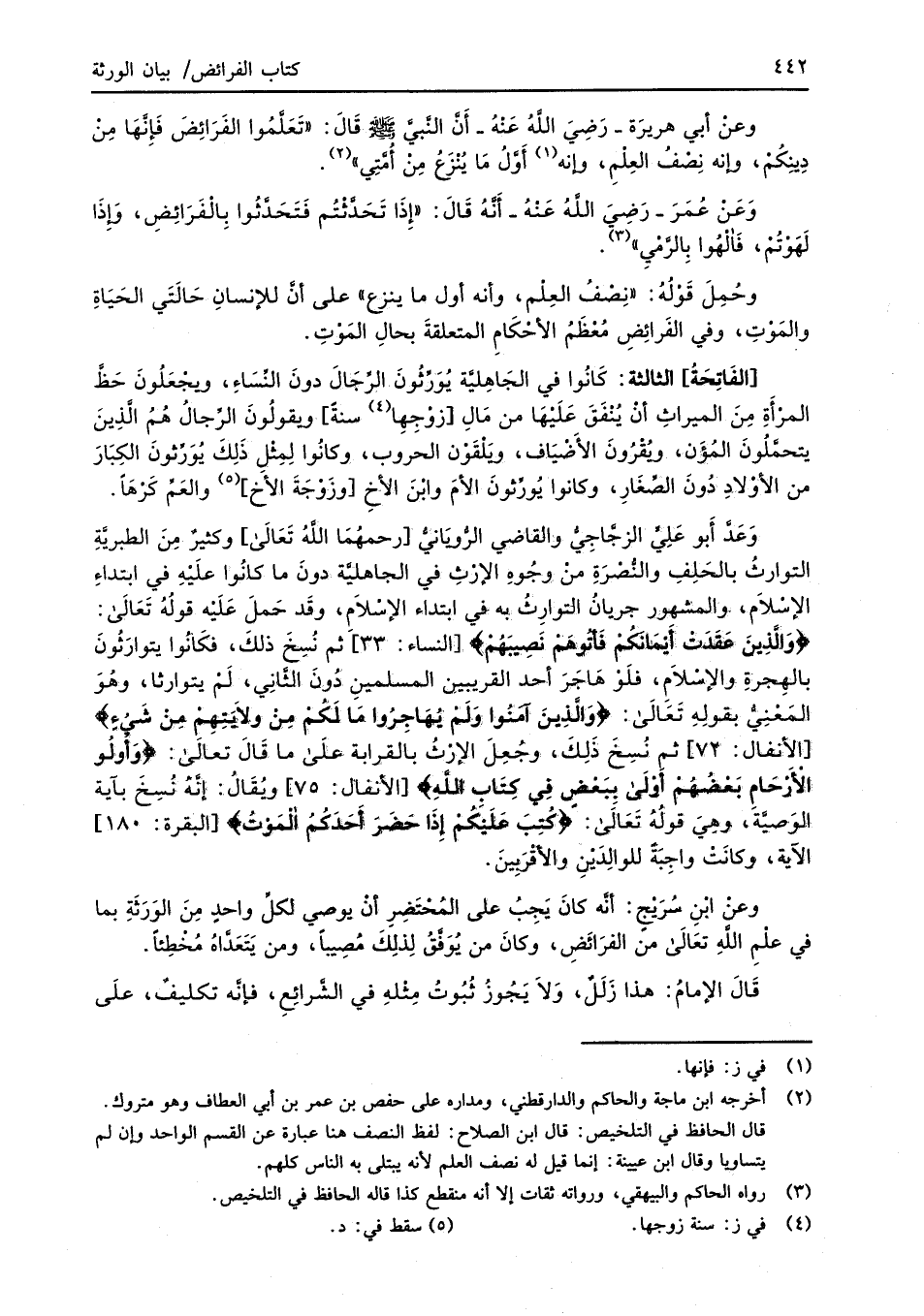 وعنْ أبي هريرَة -رَضِيَ اللهُ عَنْهُ- أَنَّ النَّبيَّ -صلى الله عليه وسلم- قَالَ: "تَعَلَّمُوا الفَرائِضَ فَإِنَّهَا مِنْ دِينِكُمْ، وإنه نِصْفُ العِلْمِ، وإنه (¬1) أَوَّلُ ما يُنْزَعُ مِنْ أُمَّتِي" (¬2).