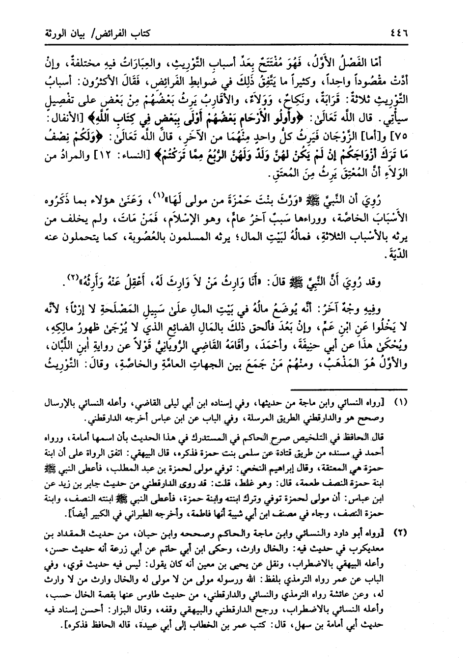 أمّا الفَصْلُ الأَوَّلُ، فَهُوَ مُفْتَتَحٌ بِعَدِّ أسباب التَّوْرِيثِ، والعِبَارَاتُ فيهِ مختلفةٌ، وإنْ أدَّتْ مقْصُوداً واحِداً، وكثيراً ما يَتَّفِقُ ذَلِكَ في ضَوابطِ الفَرائِضِ، فَقالَ الأكثرُون: أسبابُ التَّوْرِيثِ ثلاثةٌ: قَرَابَةٌ، ونَكِاحٌ، وَوَلاءٌ, والأقَارِبُ يَرِثُ بَعْضُهُمْ مِنْ بَعْضِ على تفْصِيلٍ سيأتِي. قال الله تَعالَى {وَأُولُو الْأَرْحَامِ بَعْضُهُمْ أَوْلَى بِبَعْضٍ فِي كِتَابِ اللَّهِ} [الأنفال: 75]: و [أما]، الزَّوْجَان فَيَرِثُ كلُّ واحدٍ مِنْهُمَا من الآخَر، قَالَ الله تَعالَىَ: {وَلَكُمْ نِصْفُ مَا تَرَكَ أَزْوَاجُكُمْ إِنْ لَمْ يَكُنْ لَهُنَّ وَلَدٌ فَإِنْ كَانَ لَهُنَّ وَلَدٌ فَلَكُمُ الرُّبُعُ مِمَّا تَرَكْنَ} [النساء:12] والمرادُ من الوَلاَءِ أنَّ المُعتِقَ يَرِثُ مِنَ المُعتَقِ.