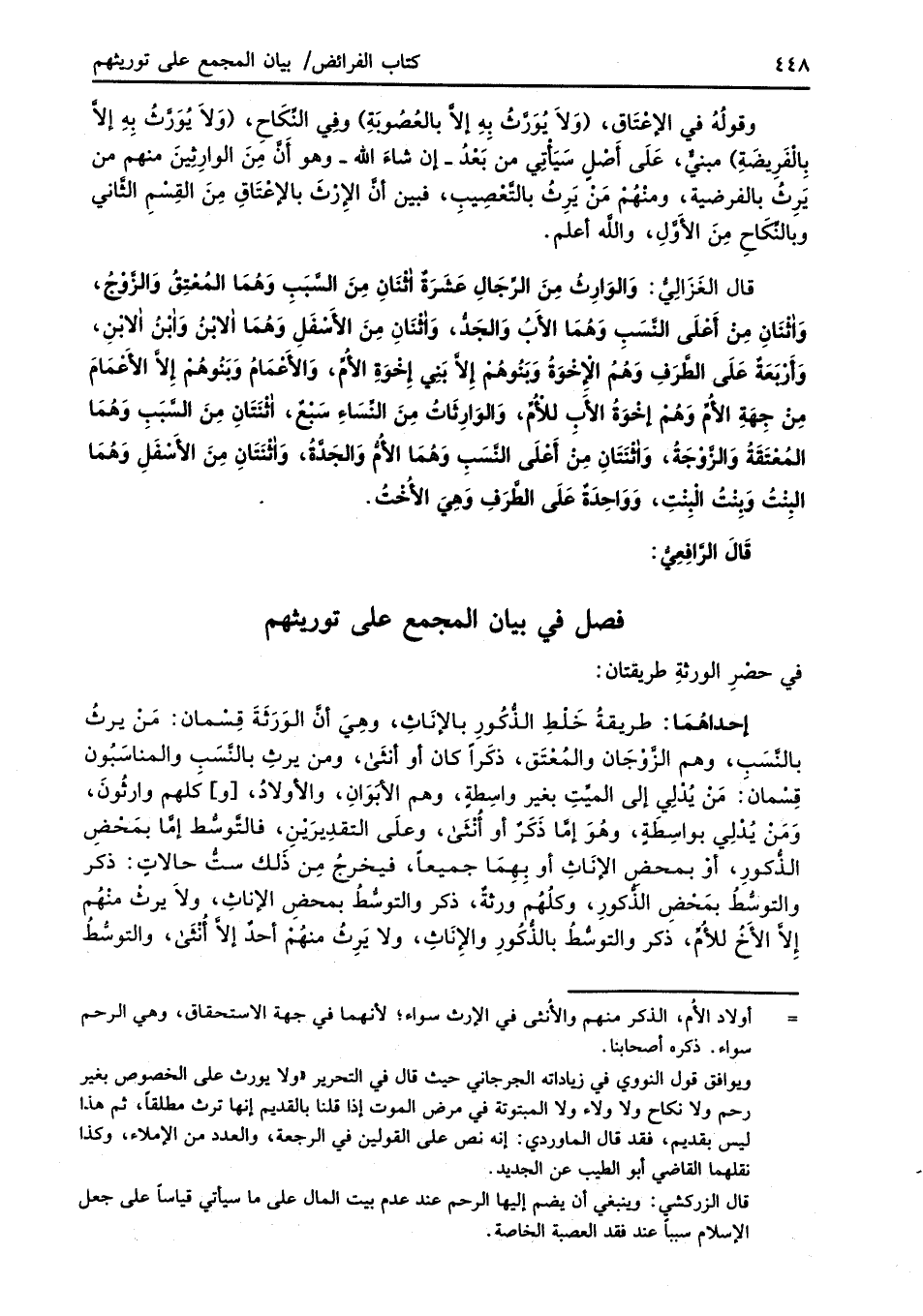 احداهُمَا: طريقةُ خَلْطِ الذُّكُورِ بالإنَاثِ، وهِيَ أنَّ الوَرَثَةَ قِسْمان: مَنْ يرثُ بالنِّسَبِ، وهم الزَّوْجَان والمُعْتَق، ذكَراً كان أو أنثَى، ومن يرثِ بالنَّسَب والمناسَبُون قِسْمانَ: مَن يُدْلِي إلى الميِّتِ بغير واسِطةٍ، وهم الأبَوَانِ، والأولادُ، [و] كَلهم وارثُونَ، وَمَنْ يُدْلِي بواسِطَةٍ، وهُوَ إمَّا ذَكَرٌ أو أُنْثَى، وعلَى التقدِيرَيْنِ، فالتَّوسُّط إمَّا بمَحْضِ الذُّكورِ، أوْ بمحض الإنَاثِ أو بِهِمَا جميعاً، فيخرجُ مِن ذَلك ستُّ حالاتٍ: ذكر والتوسُّطُ بمَحْضِ الذُّكورِ، وكلُهُم ورثةٌ، ذكر والتوسُّطُ بمحضِ الإناثِ، ولاَ يرثْ منْهُم إِلاَّ الأَخُ للأُمِّ، ذكر والتوسُّطُ بالذُّكُورِ والإِنَاثِ، ولا يَرِثُ منهُمْ أحدٌ إلاَّ أُنثَى، والتوسُّطُ