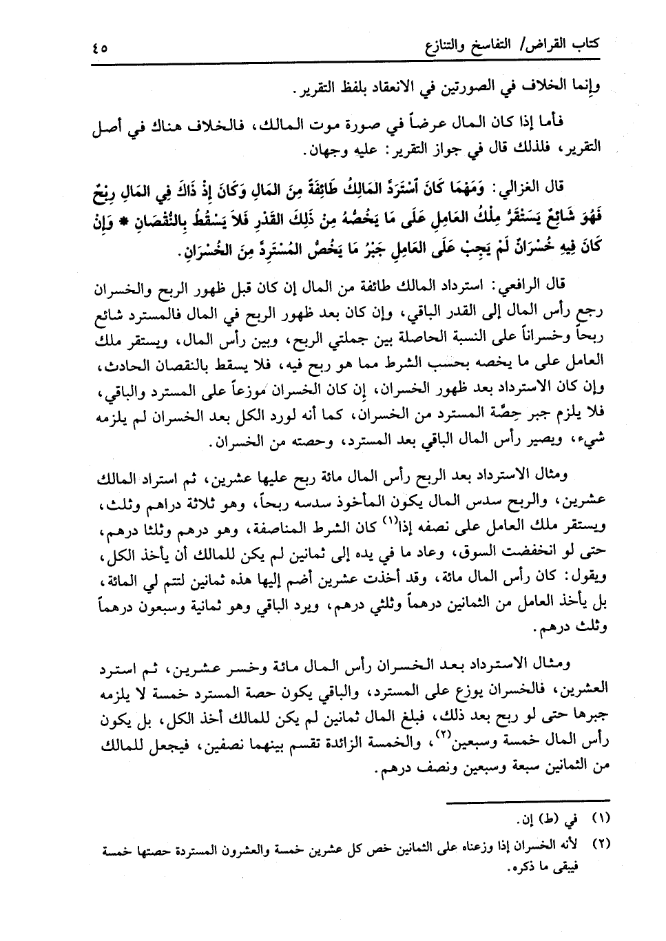 قال الغزالي: وَمَهْمَا كَانَ اسْتَرَدَّ المَالِكُ طَائِفَةً مِنَ المَالِ وَكَانَ إِذْ ذَاكَ فِي المَالِ رِبْحٌ فَهُوَ شَائِعٌ يَسَتْقَرُّ مِلْكُ العَامِلِ عَلَى مَا يَخُصُّهُ مِنْ ذَلِكَ القَدْرِ فَلاَ يَسْقُطُ بِالنُّقْصَانِ، وَإِنْ كَانَ فِيهِ خُسْرَان لَمْ يَجِبْ عَلَى العَامِلِ جَبْرُ مَا يَخُصُّ المُسْتَرِدَّ مِنَ الخُسْرَانِ.