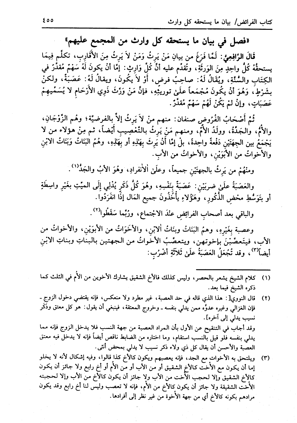 قَالَ الرَّافِعِيُّ: لَمَّا فَرَغَ من بيانِ مَنْ يَرثُ وَمَنْ لا يَرِثُ مِنَ الأَقَارِبِ، تكلَّم فِيمَا يستحقُّهُ كُلُّ واحِدٍ مِنَ الوَرثَةِ، وتُقدِّم عليه أنَّ كُلَّ وارِثٍ: إمَّا أنْ يكونَ لَهُ سَهْمٌ مُقدَّرٌ في الكِتَابِ والسُّنَّةِ، ويُقَالُ لَهُ: صاحِبُ فرضٍ، أَوْ لاَ يكُونَ، ويقالُ لَهُ: عَصَبَةٌ، ولكنْ بشَرْطِ، وَهُوَ أنْ يكُونَ مُجْمَعًا عَلَى توريثِهِ، فإنَّ مَنْ وَرَّثَ ذَوِي الأَرْحَامِ لا يُسَمِّيهِمْ عَصَباتٍ، وإنْ لمْ يَكُنْ لَهُمْ سَهْمٌ مُقدَّرٌ.