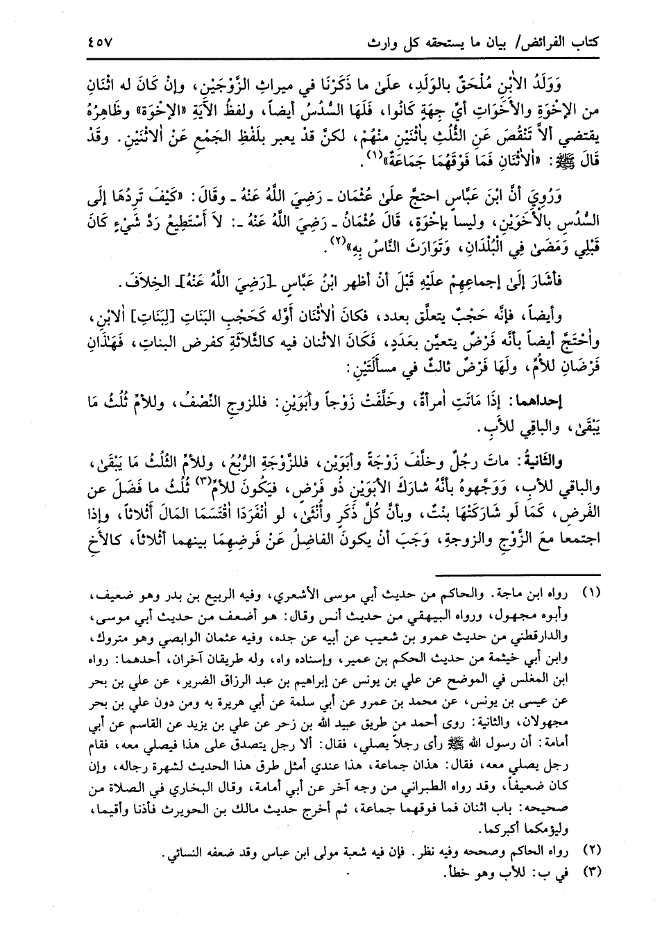 وَرُوِيَ أنَّ ابْنَ عَبَّاسٍ احتجَّ عَلَى عُثْمَان -رَضِيَ اللهُ عَنْهُ- وقالَ: "كَيْفَ تَرِدُها إلَى السُّدُسِ بالأَخَوَيْنِ، وليسا بإخْوَةٍ، قَالَ عُثْمَانُ -رَضِيَ اللهُ عَنْهُ-: لا أَسْتَطِيعُ رَدَّ شَيْءٍ كَانَ قَبْلِي وَمَضَى في الُبلْدَانِ، وَتَوَارَثَ النَّاسُ بِه" (¬2).