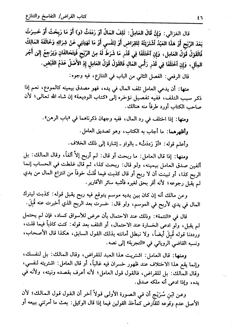 قال الغزالي: وَإِنْ قَالَ العَامِلُ: تَلِفَ المَالُ أوْ رَدَدَتُّ (و) أَوْ مَا رَبِحْتُ أَوْ خَسِرْتُ بَعْدَ الرِّبْحِ أَوْ هَذَا العَبْدُ اشْتَرَيتُهُ لِلقِرَاضِ أَوْ لِنَفْسيِ أَوْ مَا نَهَيْتَنِيِ عَنْ شِرَائِهِ وَخَالَفَهُ المَالِكُ فُالقَوْلُ قَوْلُ العَامِل، وَإِنِ اخْتَلَفَا فِي قَدْرِ مَا شَرَطَ لَهُ مِنَ الرِّبْحِ فَيَتَحَالفَانِ وَيرْجِعُ إلىَ أَجْر المِثْلِ، وَإِنِ اخْتَلَفَا فِي قَدْرِ رَأْسِ المَالِ فَالقَوْلُ قَوْلُ العَامِلِ إِذِ الأَصْلُ عَدَمُ القَبْضِ.