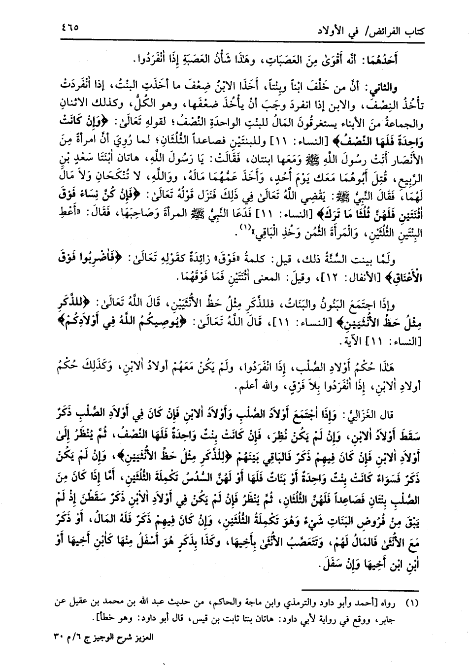 والثاني: أنَّ منْ خَلَّفَ ابْناً وبنْتاً، أَخَذَا الابْنُ ضِعْفَ ما أخَذَتِ البنْتُ، إذا انْفَردَتْ تأْخُذُ النِصْفَ، والابن إذا انفردَ وجَبَ أنْ يأْخُذَ ضعْفَها، وهو الكُلُّ، وكذلك الاثنانِ والجماعةُ منَ الأبناء يستغرقُونَ المَالُ للبنْتِ الواحدَةِ النِّصْفُ؛ لقولهِ تَعَالَى: {وَإِنْ كَانَتْ وَاحِدَةً فَلَهَا النِّصْفُ} [النساء: 11] وللبنتَيْنِ فصاعداً الثُّلُثَانِ؛ لما رُوِيَ أنَّ امرأةً مِنَ الأَنْصَار أَتَتْ رسُولَ اللهِ -صلى الله عليه وسلم- وَمَعَها ابنتان، فَقَالَتْ: يَا رَسُولَ اللهِ، هاتان ابْنَتَا سَعْدٍ بْنِ الرَّبِيع، قُتِلَ أَبُوهُمَا مَعَك يَوْمَ أُحُدٍ، وَأَخَذَ عَمُّهُمَا مَالَهُ، ووَاللهِ، لا تُنْكَحَانِ وَلاَ مَالَ لَهُمَا، فَقَالَ النَّبِيُّ -صلى الله عليه وسلم-: يَقْضِي اللهُ تَعَالَى فِي ذَلِكَ فَنَزَل قَوْلُهُ تَعَالَى: {فَإِنْ كُنَّ نِسَاءً فَوْقَ اثْنَتَيْنِ فَلَهُنَّ ثُلُثَا مَا تَرَكَ} [النساء: 11] فَدَعَا النَّبِيُّ -صلى الله عليه وسلم- المرأةَ وَصَاحِبَهَا، فَقَالَ: "أَعْطِ البِنْتَينِ الثُّلُثَيْنِ، وَالْمَرأَةَ الثُّمُن وَخُذِ الْبَاقِي" (¬1).