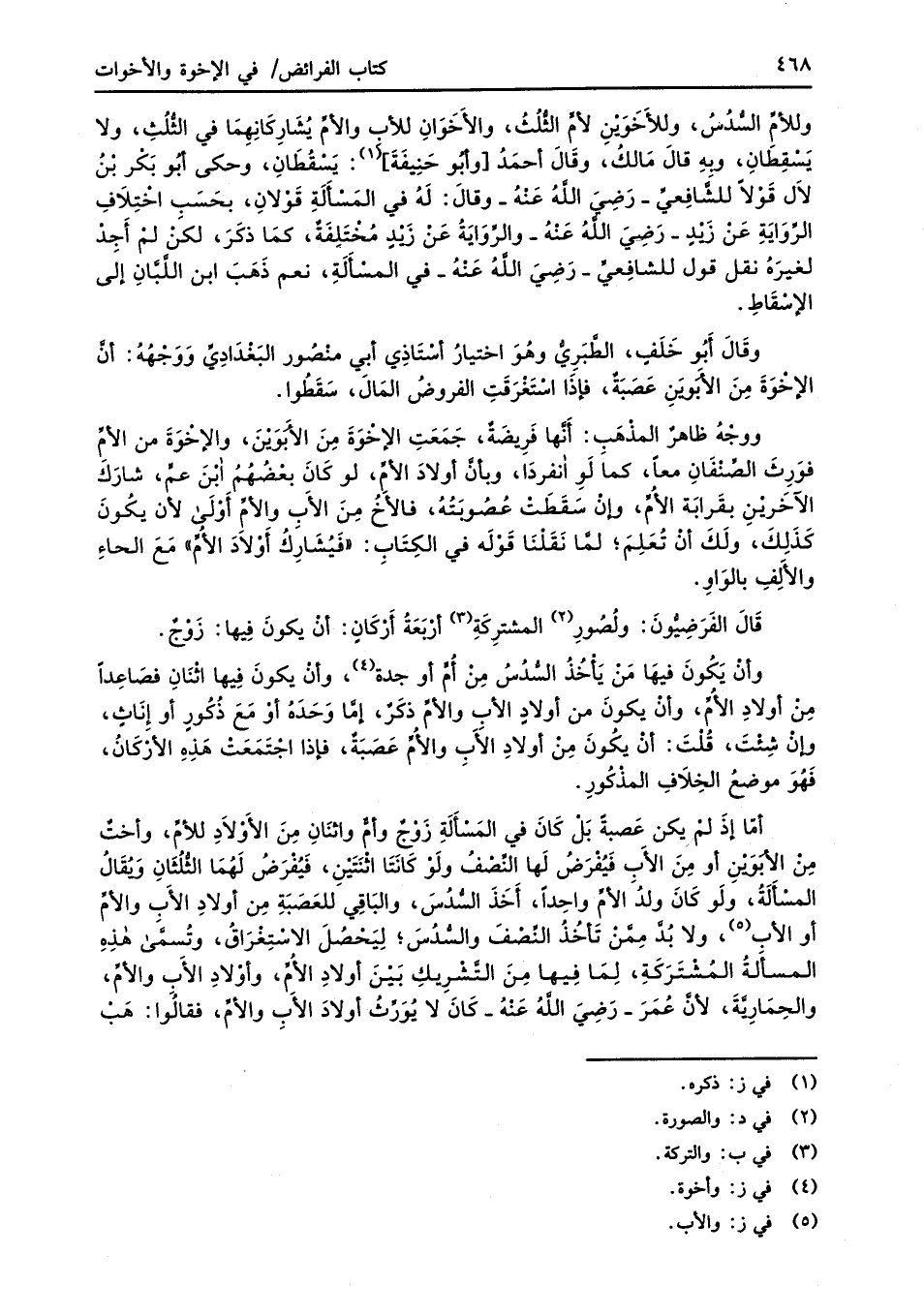 وقَالَ أَبُو خَلَفٍ، الطَّبَرِيُّ وهُوَ اختيارُ أسْتَاذِي أبي منْصُور البَغْدَادِيِّ وَوَجْهُهُ: أنَّ الإخْوَةَ مِنَ الأَبَوَينِ عَصَبَةٌ، فإذَا اسْتَغْرَقَتِ الفروضُ المَالَ، سَقَطُوا.