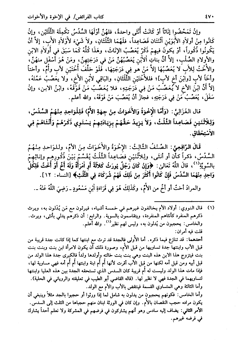 (¬1) قال النووي: أولاد الأم يخالفون غيرهم في خمسة أشياء، فيرثون مع مَن يُدْلون به، ويرث ذكرهم المنفرد كأنثاهم المنفردة، ويتقاسمون بالسرية. والرابع: أن ذكرهم يدلي بأنثى، ويرث. والخامس: يحجبون من يُدلون به، وليس لهم نظير (1). والله أعلم.