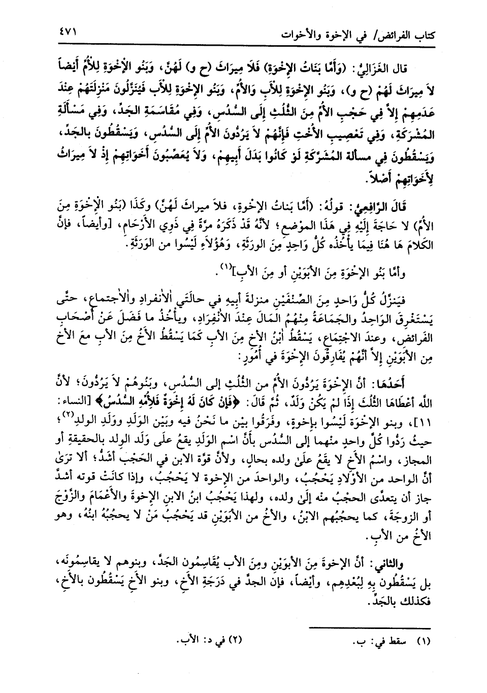 قال الغَزَالِيُّ: (وَأَمَّا بَنَاتُ الإِخْوَةِ) فَلاَ مِيرَاثَ (ح و) لَهُنَّ، وَبَنُو الْإخْوَةِ لِلْأُمِّ أَيْضاً لاَ مِيرَاثَ لَهُمْ (ح و)، وَبَنُو الإِخْوَةِ لِلْأَبِ وَالأُمِّ، وَبَنُو الاِخْوَةِ لِلْأَب فَيُنَزَّلُونَ مَنْزِلَتَهُمْ عِنْدَ عَدَمِهِمْ إِلاَّ في حَجْبِ الأُمِّ مِنَ الثُّلُثِ إِلَى السُّدُسِ، وَفي مُقَاسَمَةِ الجَدِّ، وَفِي مَسْاَلَةِ المُشْرَكَةِ، وَفِي تَعْصِيبِ الأخُتِ فَإنَّهُمْ لاَ يَرُدُّونَ الأُمِّ إِلَى السُّدُسِ، وَيَسْقُطُونَ بالجَدِّ، وَيَسْقُطُونَ في مسألة المُشَرَّكَةِ لَوْ كَانُوا بَدَلَ أَبِيهِمْ، وَلاَ يُعَصِّبُونَ أَخَوَاتِهِمْ إِذْ لاَ مِيرَاثُ لِأَخَوَاتِهِمْ أَصْلاً.