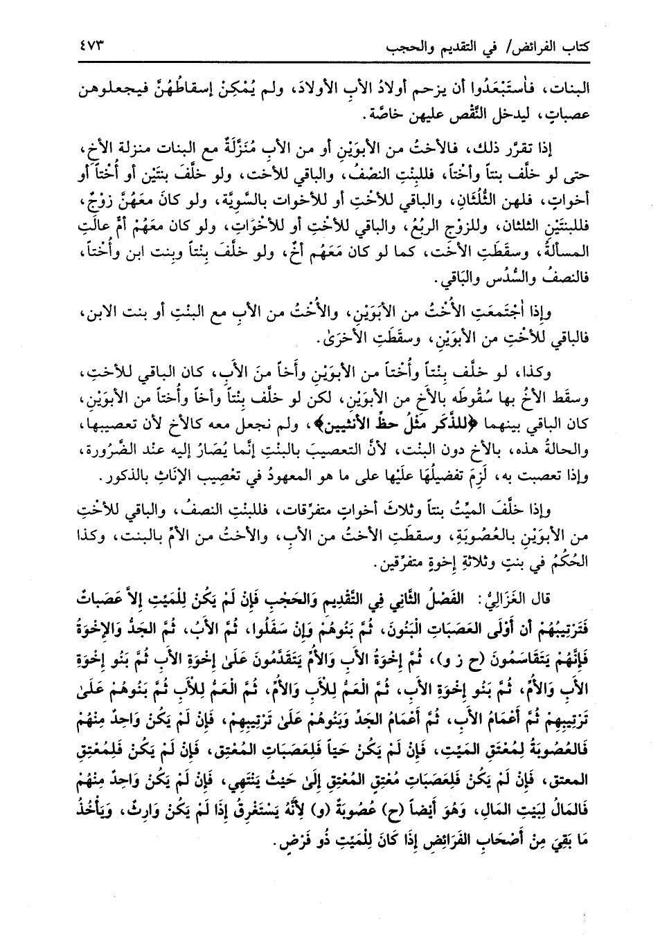 وكذا، لو خلَّف بِنْتاً وأُختاً من الأبوَيْنِ وأَخاً منَ الأَبِ، كان الباقي للأختِ، وسقَط الأخُ بها سُقُوطَه بالأَخ من الأبوَيْنِ، لكن لو خلَّف بِنْتاً وأخاً وأُختاً من الأبوَيْنِ، كان الباقي بينهما {لِلذَّكَرِ مِثْلُ حَظِّ الْأُنْثَيَيْنِ}، ولم نجعل معه كالأخ لأن تعصيبها، والحالةُ هذه، بالأخ دون البنْت؛ لأنَّ التعصيبَ بالبنْتِ إنَّما يُصَارُ إليه عنْد الضَّرُورة، وإذا تعصبت به، لَزِمَ تفضيلُهَا علَيْها على ما هو المعهودُ في تعْصِيب الإنَاثِ بالذكور.