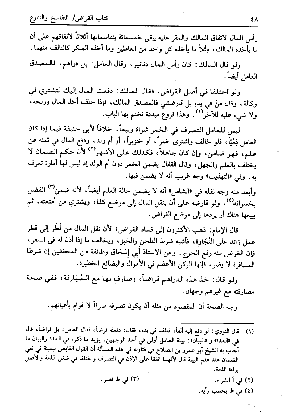 (¬1) قال النووي: لو دفع إليه ألفاً، فتلف في يده، فقال: دفعتُه قرضاً، فقال العامل: بل قراضاً، قال في "العدة" و"البيان": بينة العامل أولى في أحد الوجهين. يؤيد ما ذكره في العدة والبيان ما أجاب به الشيخ أبو عمرو بن الصلاح في فتاويه في هذه المسألة أن القول القابض بيمينة في نفي الضمان عند عدم البينة قال لأنهما اتفقا على الإذن في التصرف واختلفا في شغل الذمة والأصل براءة الذمة.