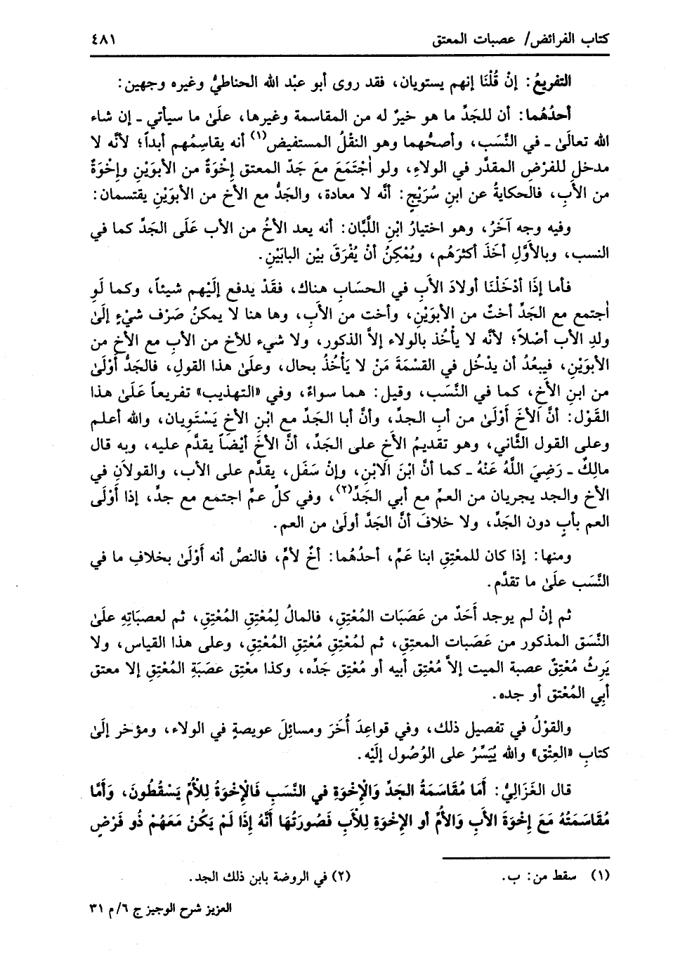 فأما إذَا أدْخَلْنَا أولادَ الأَبِ في الحسَاب هناك، فقَدْ يدفع إلَيْهم شيئاً، وكما لَوِ اجتمع مع الجَدِّ أختٌ من الأبوَيْنِ، وأخت من الأَب، وهاهنا لا يمكنُ صَرْف شيْءٍ إلَى ولدِ الأب أصْلاً؛ لأنَّه لا يأْخُذ بالولاء إلاَّ المذكور، ولا شيء للأخ من الأبِ مع الأخِ من الأبوَيْنِ، فيبعُدُ أن يدْخُل في القسْمَةَ مَنْ لا يَأْخُذُ بحال، وعلَى هذا القولِ، فالجَدُّ أوْلَى من ابنِ الأَخِ، كما في النَّسَب، وقيل: هما سواءٌ، وفي "التهذيب" تفريعاً عَلَى هذا القَوْل: أنَّ الأَخِ أَوْلَى من أب الجدِّ، وأنَّ أبا الجَدِّ مع ابْنِ الأخِ يَسْتَوِيان، والله أعلم وعلى القول الثَّاني، وهو تقَديمُ الأَخِ على الجَدِّ، أنَّ الأخَ أيْضاً يقدَّم عليه، وبه قال مالِكٌ -رَضِيَ اللهُ عَنْهُ- كما أنَّ ابنَ الَابْنِ، وإنْ سَفَل، يقدَّم على الأب، والقولاَنِ في الأخ والجد يجريان من العمِّ مع أبي الجَدِّ (¬2)، وفي كلِّ عمٍّ اجتمع مع جدٍّ، إذا أَوْلَى العم بأبٍ دون الجَدِّ، ولا خلافَ أنَّ الجَدَّ أولَى من العم.