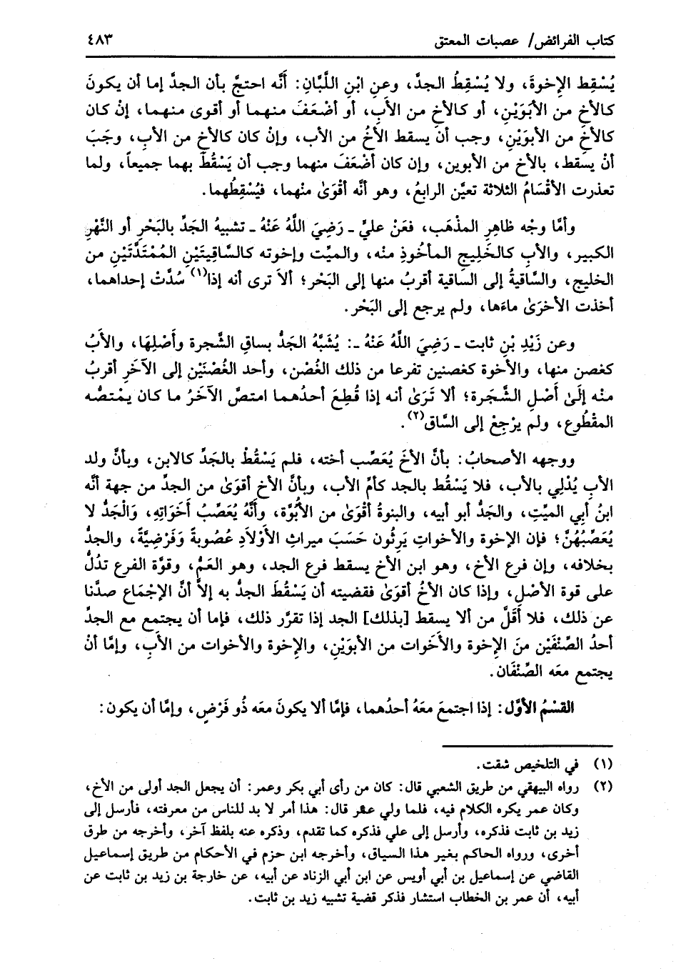 وعن زَيْدِ بْنِ ثابت -رَضِيَ اللَّهُ عَنْهُ-: يُشَبَّهُ الجَدُّ بساقِ الشَّجرة وأَصْلِهَا، والأَبُ كغصن منها، والأخوة كغصنين تفرعا من ذلك الغُصْن، واحد الغُصْنَيْن إلى الآخَرِ أقربُ منْه إلَى أَصْلِ الشَّجَرة؛ ألا تَرَى أنه إذا قُطِعَ أحدُهما امتصَّ الآخَرُ ما كان يمْتصُّه المقْطُوع، ولم يرْجِعْ إلى السَّاق (¬2).