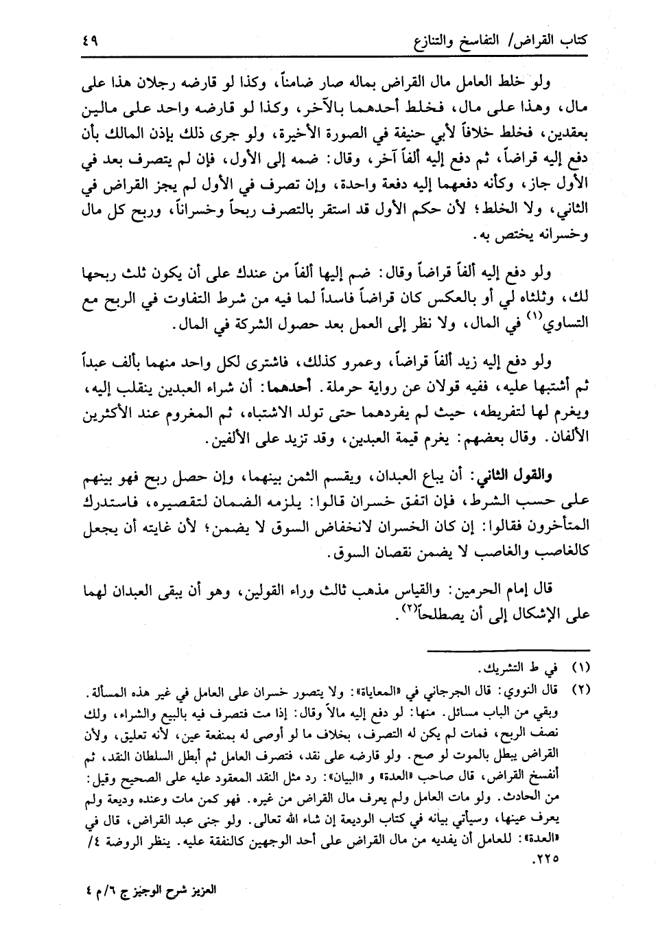(¬2) قال النووي: قال الجرجاني في "المعاياة": ولا يتصور خسران على العامل في غير هذه المسألة. وبقي من الباب مسائل. منها: لو دفع إليه مالاً وقال: إذا مت فتصرف فيه بالبيع والشراء، ولك نصف الربح، فمات لم يكن له التصرف، بخلاف ما لو أوصى له بمنفعة عين؛ لأنه تعليق، ولأن القراض يبطل بالموت لو صح. ولو قارضه على نقد، فتصرف العامل ثم أبطل السلطان النقد، ثم أنفسخ القراض، قال صاحب "العدة" و"البيان": رد مثل النقد المعقود عليه على الصحيح وقيل: من الحادث. ولو مات العامل ولم يعرف مال القراض من غيره. فهو كمن مات وعنده وديعة ولم يعرف عينها، وسيأتي بيانه في كتاب الوديعة إن شاء الله تعالى. ولو جنى عبد القراض، قال في "العدة": للعامل أن يفديه من مال القراض على أحد الوجهين كالنفقة عليه. ينظر الروضة 4/ 225.
