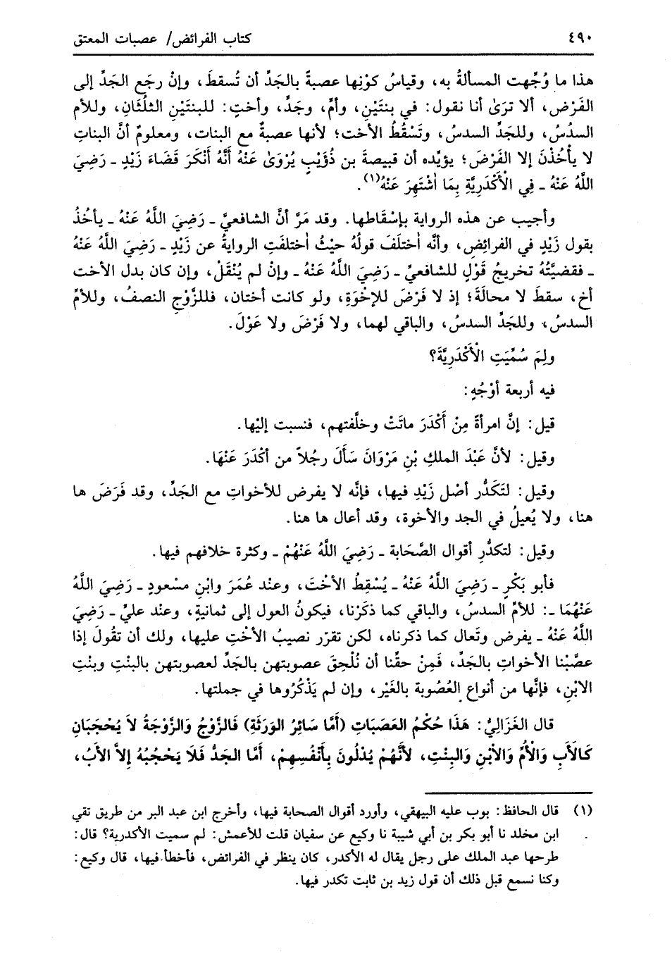(¬1) قال الحافظ: بوب عليه البيهقي، وأورد أقوال الصحابة فيها، وأخرج ابن عبد البر من طريق تقي ابن مخلد نا أبو بكر بن أبي شيبة نا وكيع عن سفيان قلت للأعمش: لم سميت الأكدرية؟ قال: طرحها عبد الملك على رجل يقال له الأكدر، كان ينظر في الفرائض، فأخطأ. فيها، قال وكيع: وكنا نسمع قبل ذلك أن قول زيد بن ثابت تكدر فيها.