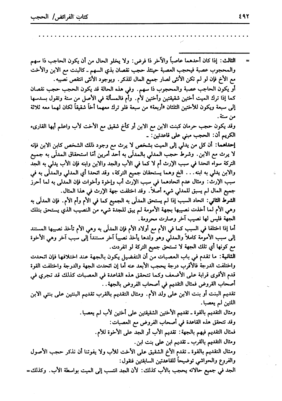 إحداهما: أن كل من يدلي إلى الميت بشخص لا يرث مع وجود ذلك الشخص كابن الابن فإنه لا يرث مع الابن. وشرط حجب المدلي بالمدلَى به أحد أمرين أمّا استحقاق المدلَى به جميع التركة سواء اتحدا في سبب الإرث أم لا كما في الأب والجد والابن وابنه فإن الأب يدلي به الجد والابن يدلي به ابنه ... الخ وهما يستحقان جميع التركة، وقد اتحدا أي المدلي والمدلَى به في سبب الإرث: ومثال عدم اتحادهما في سبب الإرث أب وإخوة وأخوات فإن المدلى به لما أحرز جميع المال لم يسبق للمدلي شيء أصلاً. وقد اختلفت جهة الإرث في هذا المثال.