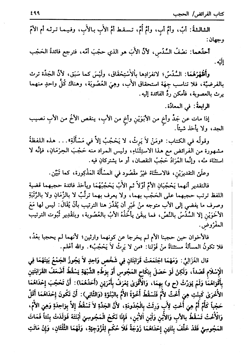 وقولُه في الكتاب: "ومَنْ لاَ يَرِثُ، لا يَحْجُبُ إلاَّ في مَسْأَلَةِ" ... هذه اللفظةُ مشهورة من الفرائض مع هذا الاستِثْنَاءِ، وليس المراد منه حَجْبَ الحِرْمَانِ، فإنِّه لا استثنَاءَ منْه، وإنَّما المُرَادُ حَجْبُ النقصان، أو ما يشتركانِ فيه.