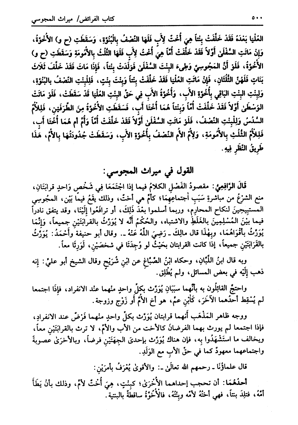 قَالَ الرَّافِعِيُّ: مقصودُ الفَصْلِ الكلامُ فيما إذا اجْتَمَعَا فِي شَخْصٍ وَاحدٍ قرابَتَانِ، منع الشرْعُ من مباشرةِ سَبَبِ اجتماعِهِمَا؛ كأمٍّ هي أختٌ، وذلك يقَعُ فيما بَيْن، المجُوسِي المستبِيحِينَ لنكاح المحارِمِ، وربما أسلموا بعْدَ ذَلِكَ، أو ترافَعُوا إِلَيْنَا، وقد يتفق نادراً فيما بيْنَ المُسْلِمِينَ بالغَلَطِ والاشتباه، والحُكْمُ أَنَّه لا يُوَرَّثُ بالقرابَتَيْنِ جميعاً، وَإِنَّمَا يُوَرَّثُ بأقْوَاهُمَا، وبِهذَا قال مالِكَ -رَضِيَ اللهُ عَنْهُ-. وقال أبو حنيفة وأَحْمَدُ: يُوَرَّثُ بالقَرَابَتَيْنِ جميعاً، إذا كانت القرابتان بحَيْثُ لو وُجِدَتَا في شخصَيْنِ، لَوَرِثَا معاً.