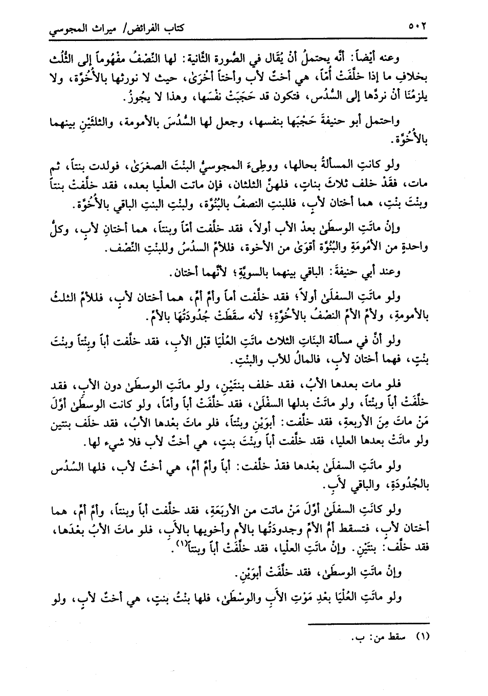 فلو مات بعدها الأبُ، فقد خلف بنتَيْنِ، ولو ماتَتِ الوسطَى دون الأبِ، فقد خلَّفَتْ أباً وبنتاً، ولو ماتَتْ بدلها السفْلَى، فقد خلَّفَتْ أباً وأمّاً، ولو كانت الوسطَى أوَّلَ مَنْ ماتَ مِنَ الأربعةِ، فقد خلَّفت: أبوَيْنِ وبنْتاً، فلو ماتَ بعْدها الأبُ، فقد خلَف بنتين ولو ماتَتْ بعدها العليا، فقد خلَّفت أباً وبنْتَ بنتٍ، هي أختٌ لأب فلا شيء لها.