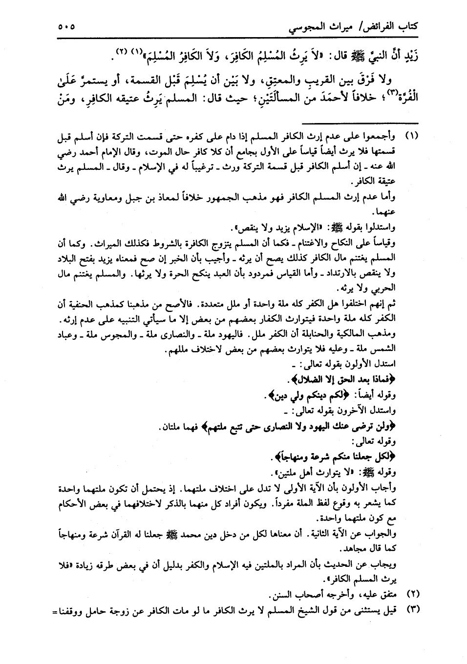 (¬1) وأجمعوا على عدم إرث الكافر المسلم إذا دام على كفره حتى قسمت التركة فإن أسلم قبل قسمتها فلا يرث أيضاً قياساً على الأول بجامع أن كلا كافر حال الموت، وقال الإمام أحمد -رضي الله عنه- إن أسلم الكافر قبل قسمة التركة ورث -ترغيباً له في الإسلام- وقال -المسلم يرث عتيقة الكافر.