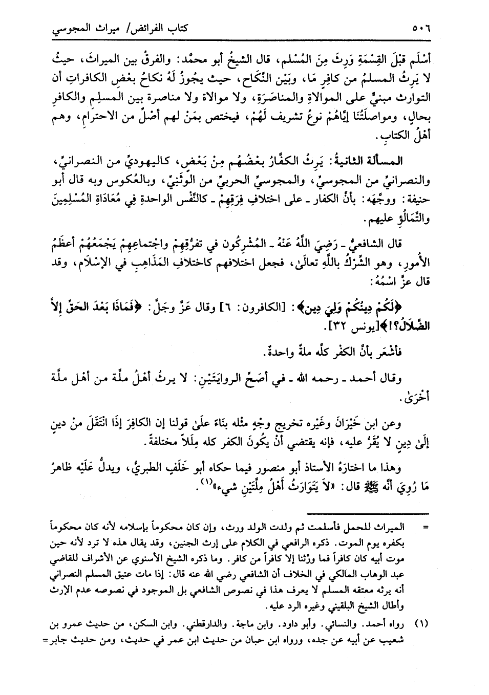 المسألة الثانيةُ: يَرِثُ الكفَّارُ بعْضُهُم مِنْ بَعْضٍ، كاليهوديِّ من النصرانىِّ، والنصرانيِّ من المجوسيِّ، والمجوسيِّ الحربيِّ من الوثَنِيِّ، وبالعْكوس وبه قال أبو حنيفة: ووجَّهَه: بأنَّ الكفار -على اختلافِ فِرَقِهِمْ- كالنَّفْس الواحدةِ فِي مُعَادَاةِ المُسْلِمِينَ والتَّمَالُؤِ عليهم.