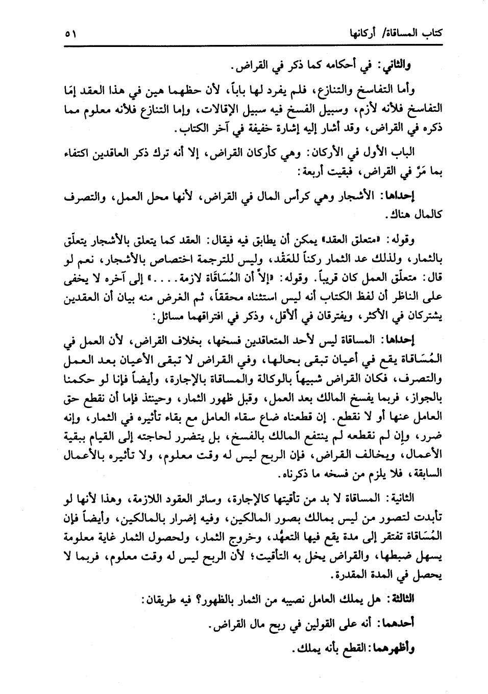 إحداها: المساقاة ليس لأحد المتعاقدين فسخها، بخلاف القراض؛ لأن العمل في المُسَاقاة يقع في أعيان تبقى بحالها، وفي القراض لا تبقى الأعيان بعد العمل والتصرف، فكان القراض شبيهاً بالوكالة والمساقاة بالإجارة، وأيضاً فإنا لو حكمنا بالجواز، فربما يفسخ المالك بعد العمل، وقبل ظهور الثمار، وحينئذ فإما أن نقطع حق العامل عنها أو لا نقطع. إن قطعناه ضاع سقاء العامل مع بقاء تأثيره في الثمار، وإنه ضرر، وإِن لم نقطعه لم ينتفع المالك بالفسخ، بل يتضرر لحاجته إلى القيام ببقية الأعمال، ويخالف القراض، فإن الربح ليس له وقت معلوم، ولا تأثيره بالأعمال السابقة، فلا يلزم من فسخه ما ذكرناه.