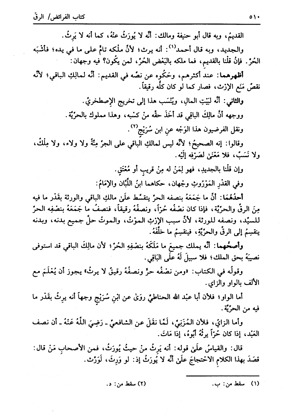 وقولُه في الكتاب: "ومن نصْفُه حرٌّ ونصفُهُ رقيقٌ لا يرثُ" يجوز أن يُعْلَمَ مع الألف بالواو والزاي.