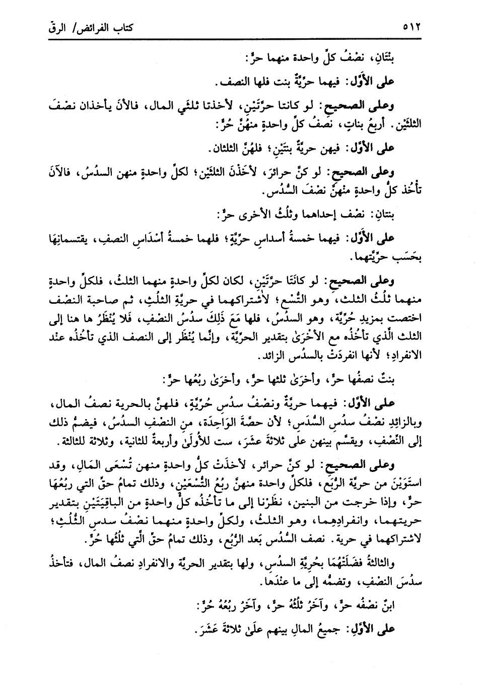 وعلى الصحيحِ: لو كانتا حرَّتَيْنِ، لأخذتا ثلثَي المال، فالأنَ يأخذان نصْفَ الثلثَيْن. أربعُ بناتٍ، نصفُ كلِّ واحدةٍ منهُنَّ حُرٌّ: