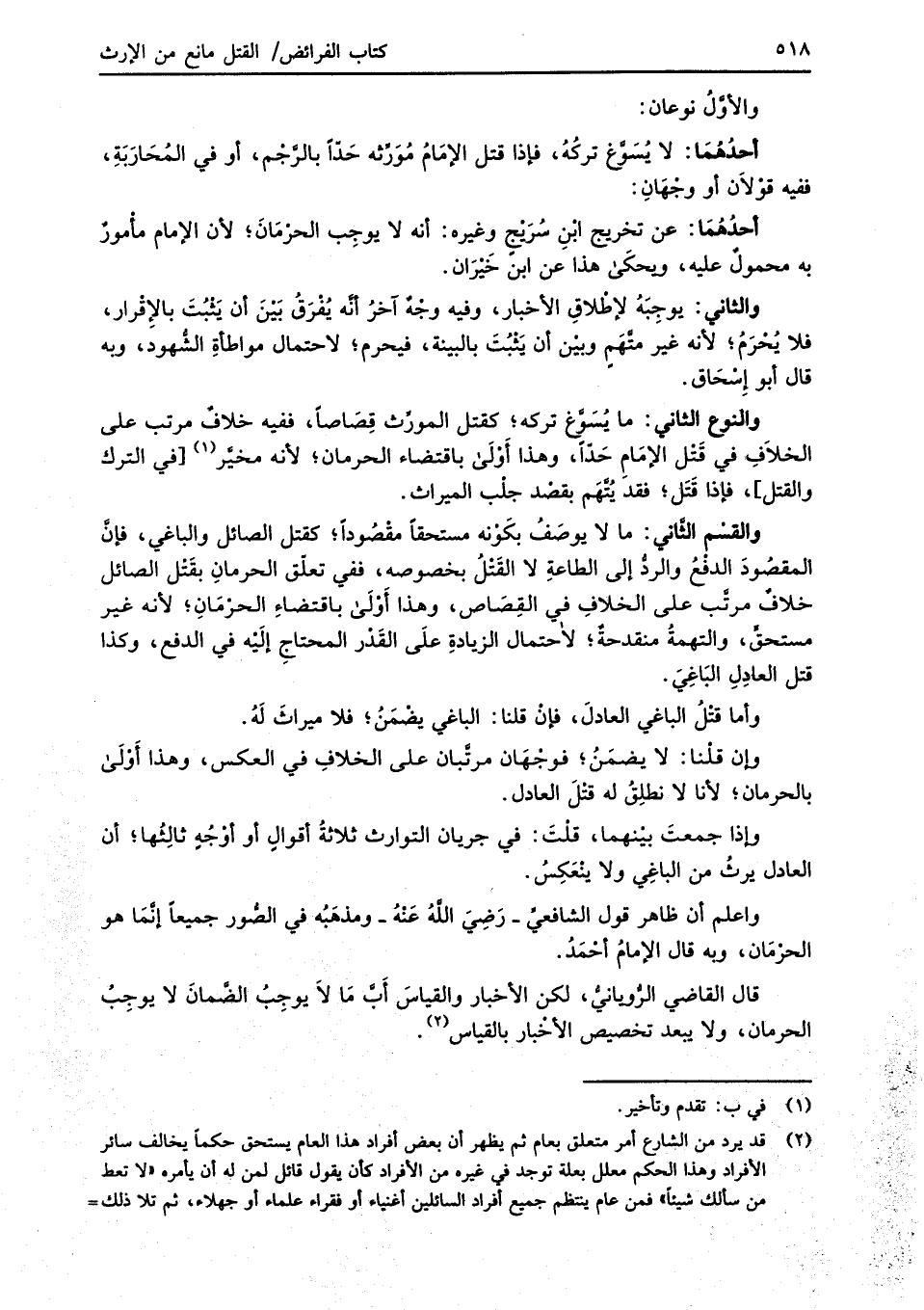 والنوع الثاني: ما يُسَوَّغ تركه؛ كقتل المورِّث قِصَاصاً، ففيه خلافٌ مرتب على الخلاَفِ في قَتْل الإمَامِ حَدّاً، وهذا أَوْلَى باقتضاء الحرمان؛ لأنه مخيَّر (¬1) [في الترك والقتل]، فإذا قَتَل؛ فقد يُتَّهَم بقصْد جلْب الميراث.