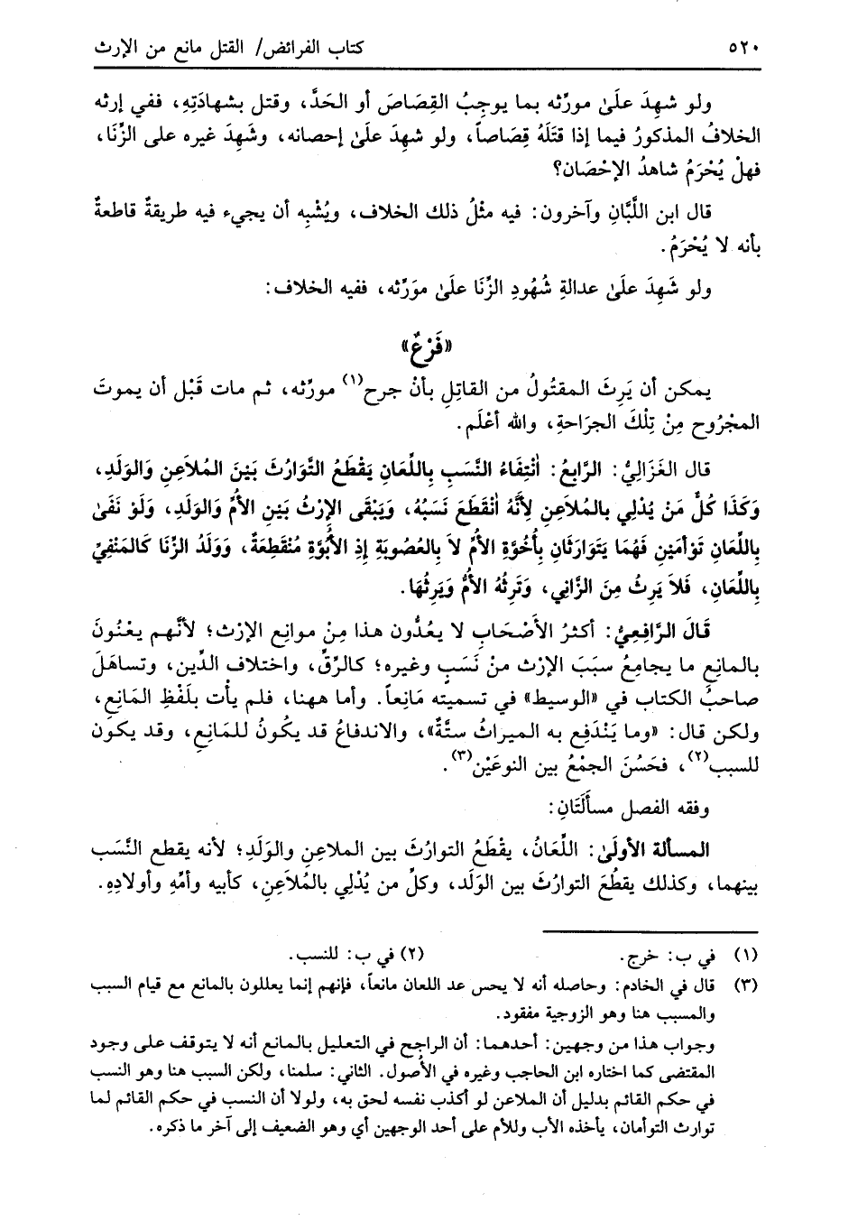وجواب هذا من وجهين: أحدهما: أن الراجح في التعليل بالمانع أنه لا يتوقف على وجود المقتضى كما اختاره ابن الحاجب وغيره في الأُصول. الثاني: سلمنا, ولكن السبب هنا وهو النسب في حكم القائم بدليل أن الملاعن لو كذب نفسه لحق به، ولولا أن النسب في حكم القائم لما توارث التوأمان، يأخذه الأب وللأم على أحد الوجهين أي وهو الضعيف إلى آخر ما ذكره.