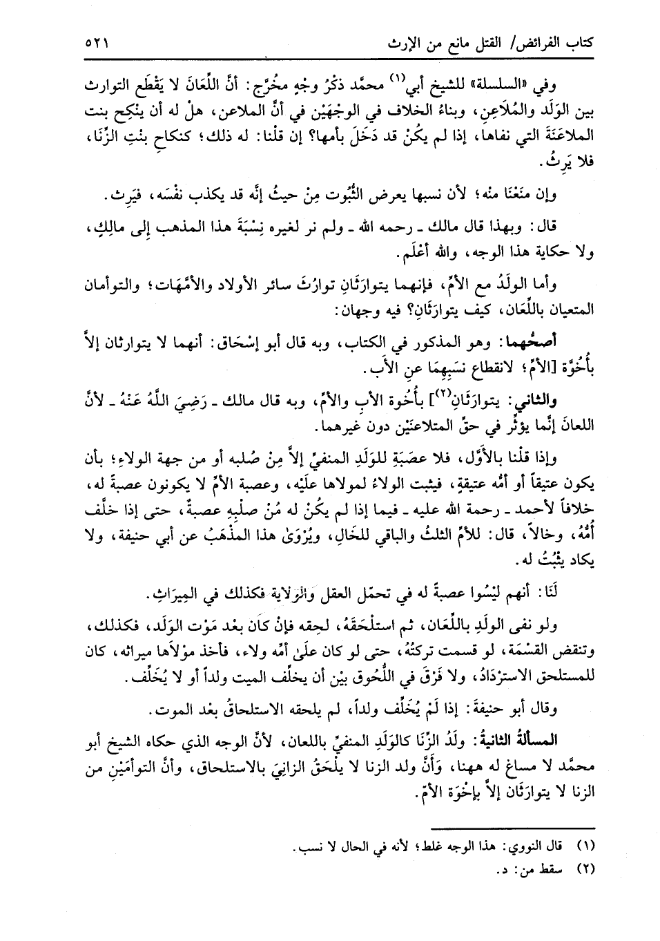 المسألةُ الثانيةُ: ولَدُ الزِّنَا كالوَلَدِ المنفيِّ باللعان, لأنَّ الوجه الذي حكاه الشيخ أبو محمَّد لا مساغ له ههنا، وَأَنَّ ولد الزنا لا يلْحَقُ الزانِيَ بالاستلحاق، وأنَّ التوأمَيْنِ من الزنا لا يتوارَثَان إلاَّ بإخْوَة الأمّ.
