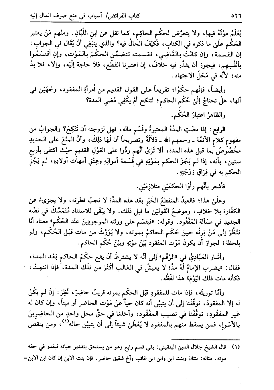 وعلَى هذا؛ فالعبدُ المنقطعُ الخَبَرِ بعْد هذه المدَّة لا تجبُ فطرته، ولا يجزئُ عن الكفَّارة بلا خلافٍ، وموضعُ القَوليْن ما قبل ذلك. ولا يبْقَى للاستناد مُتَمَسَّكٌ في نصِّه الجديدِ في مسْألة المَفْقُود. وقوله: "فيقسّم على ورثته الموجودِينَ عند الحُكْم" معناه أنَّا ننْظُرُ إلى مَنْ يَرِثُه حينَ حَكَم الحاكمُ بموته، ولا يُوَرَّثُ من مات قبْل الحُكْم، ولو بلحظة؛ لجواز أن يكونَ مَوْت المفقود بَيْنَ موْتِهِ وبيْنَ حُكْم الحاكم.